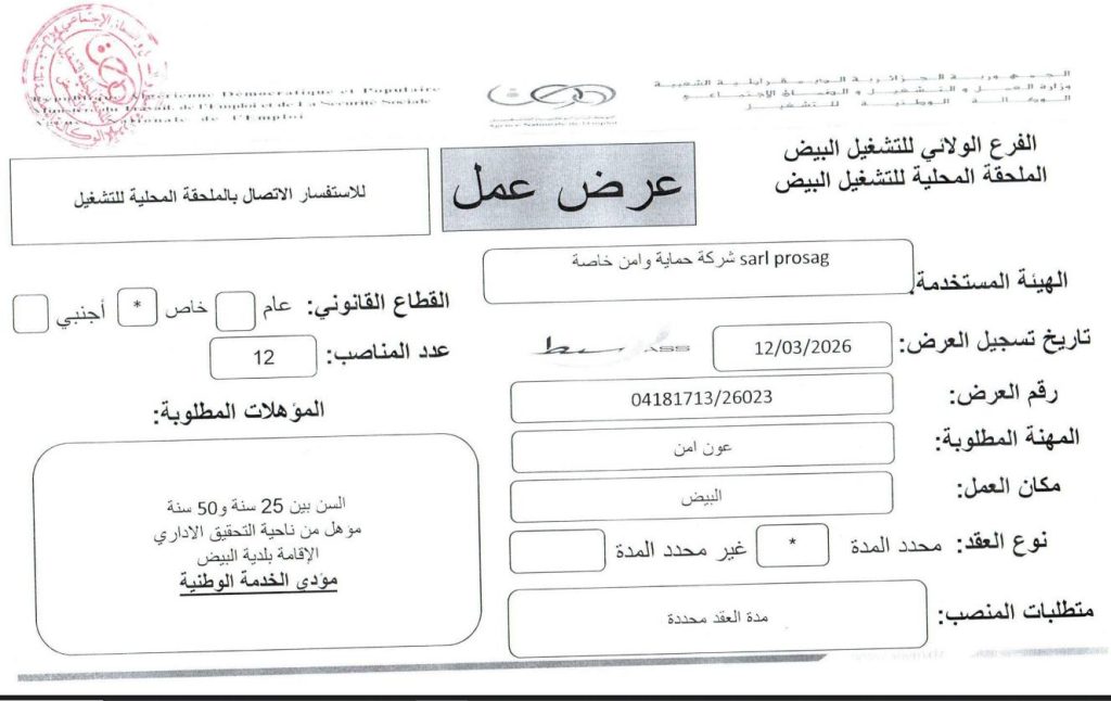 لهيئة المستخدمة: sarl prosag شركة حماية وامن خاصة