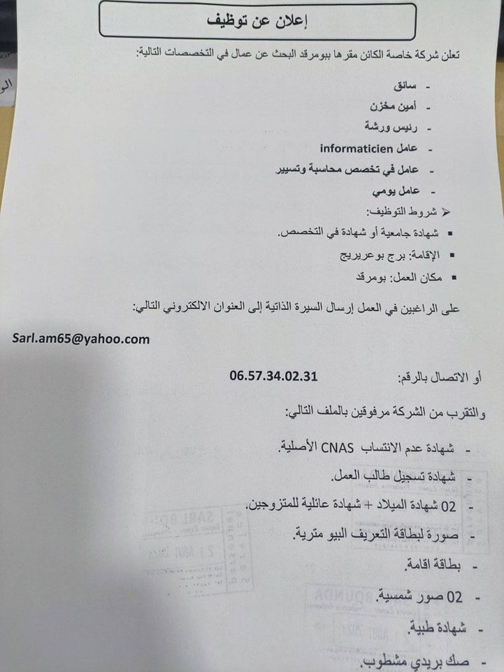 شركة خاصة ببرج بوعريريج تبحث عن عمال في مختلف المجالات