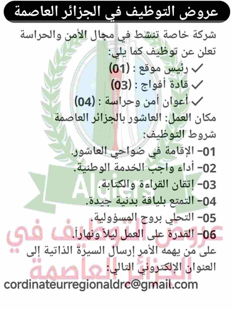 شركة خاصة تنشط في مجال الأمن والحراسة بالجزائر تعلن عن توظيف : قادة افواج واعوان أمن
