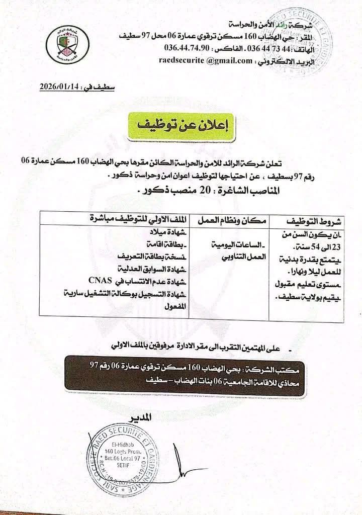 شركة رائد تعلن احتياجاتها لتوظيف أعوان أمن وحراسة (20 منصب)