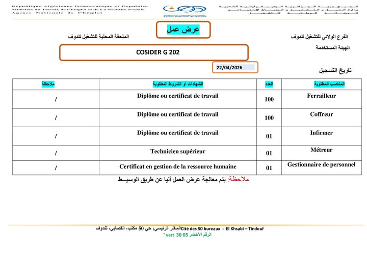 | Coffreur (بناء قوالب/نجار) | 100 | دبلوم أو شهادة عمل | / |