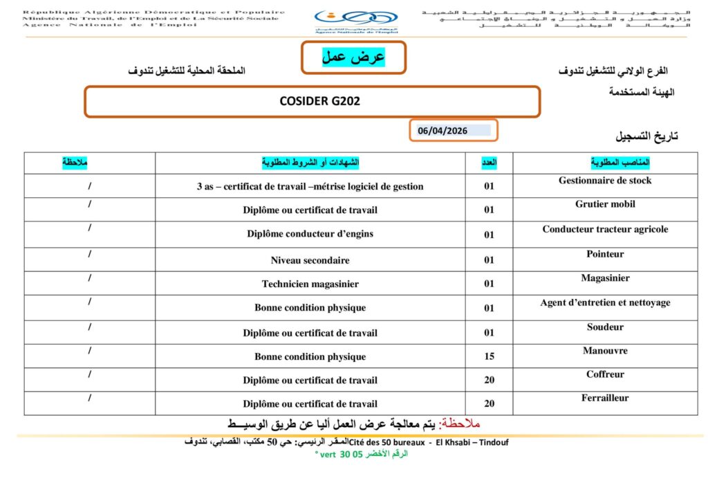 • الفرع: الفرع الولائي للتشغيل تندوف (الملحقة المحلية للتشغيل تندوف)