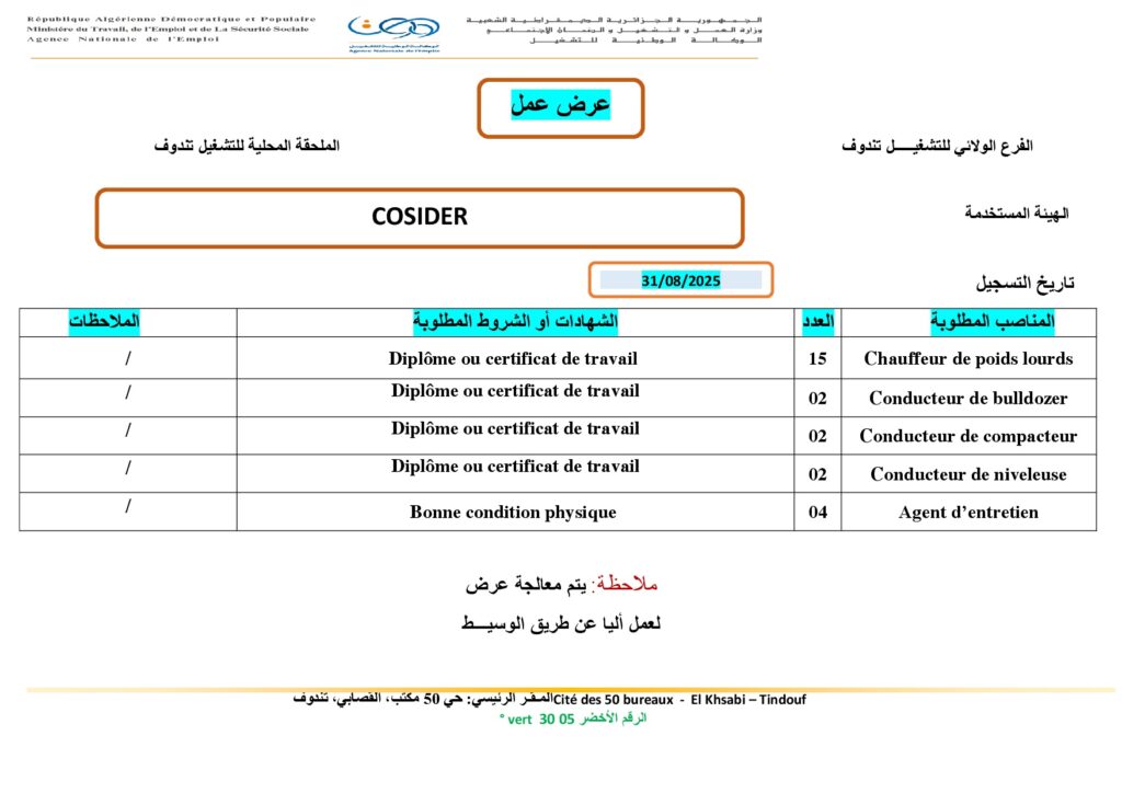 تتم معالجة هذا العرض آليًا عن طريق الوسيط (الوكالة الوطنية للتشغيل).