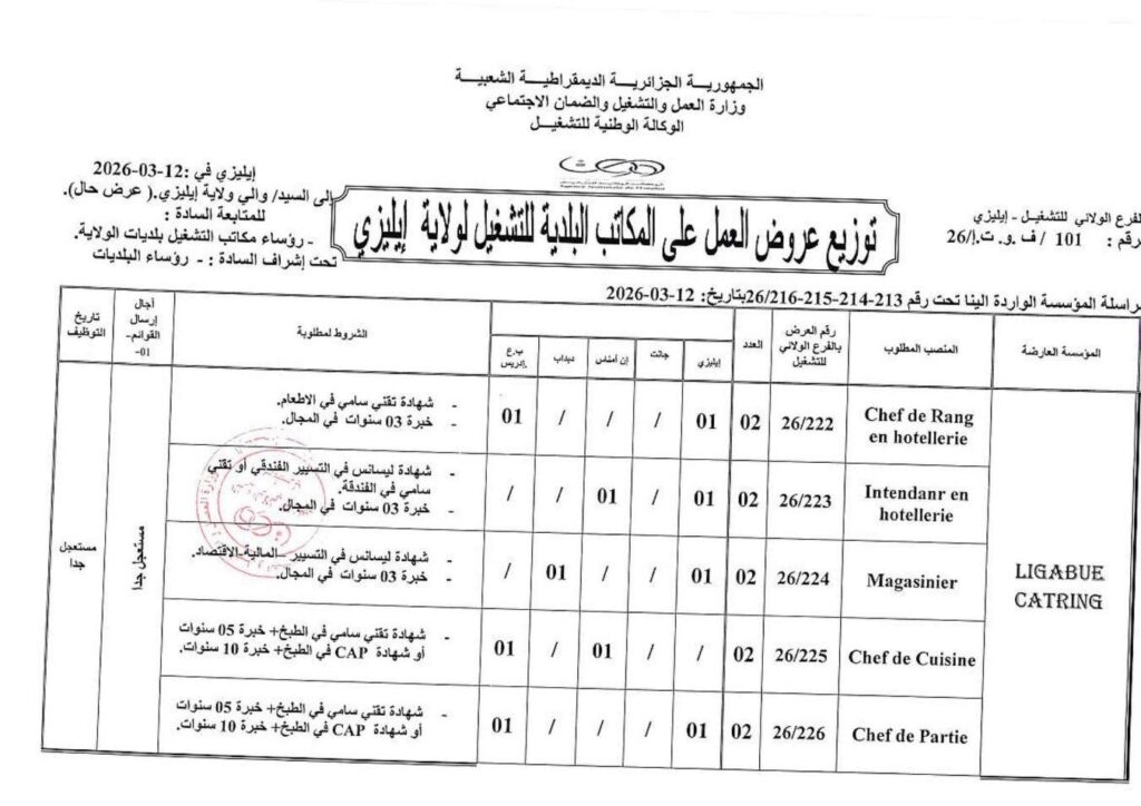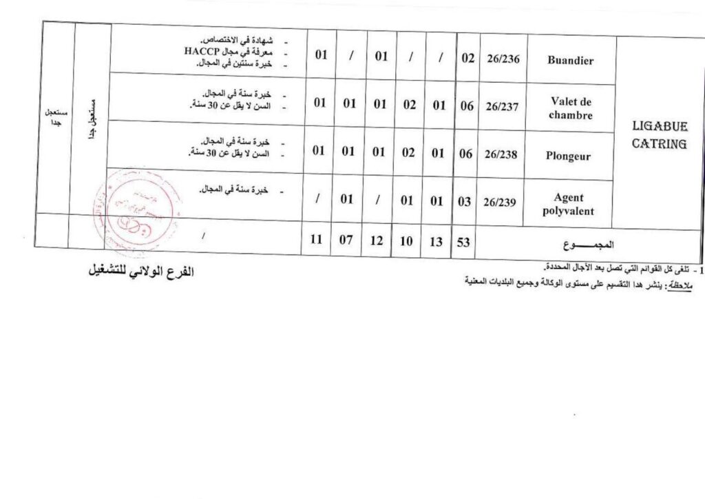 | Cafitier | 26/230 | 04 | شهادة تقني في الإطعام + خبرة سنتين |