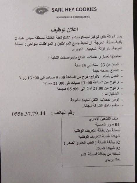 تعلن شركة هاي كوكيز المختصة في إنتاج البسكويت والشكولاطة، والكائنة بـ منطقة سيدي عباد 2 – بلدية تسالة المرجة، عن فتح باب التوظيف لفائدة سكان المناطق التالية: