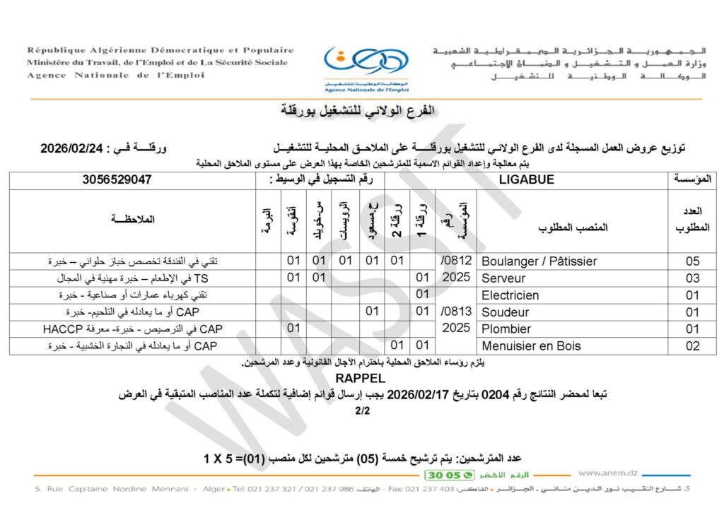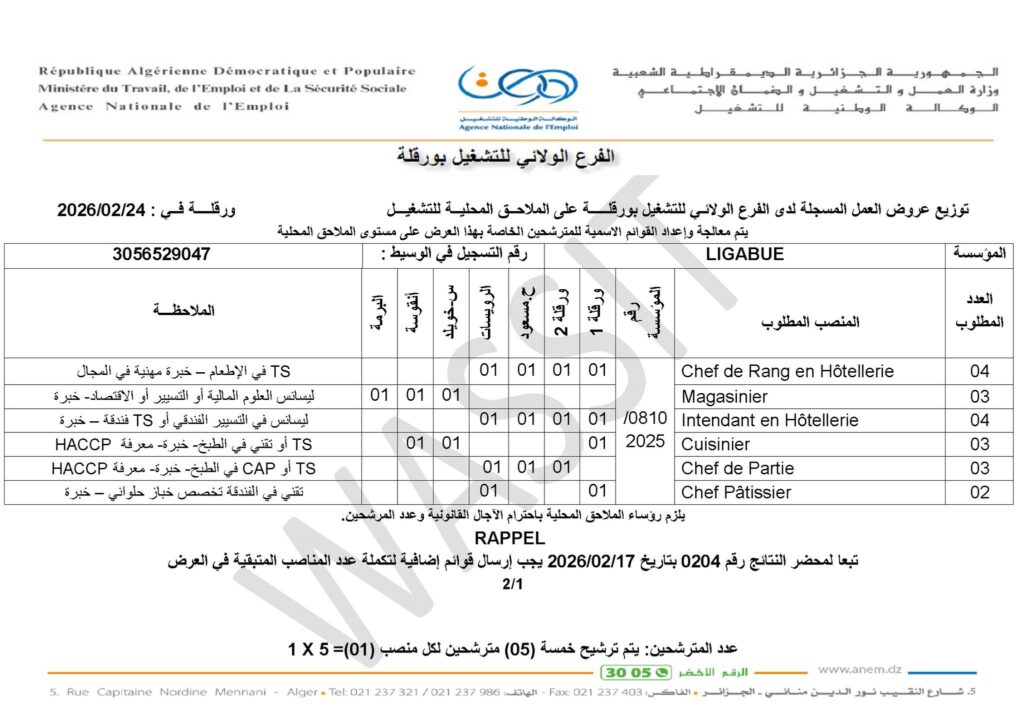 • تذكير (RAPPEL): تبعا لمحضر النتائج رقم 0204 بتاريخ 17/02/2026، يجب إرسال قوائم إضافية لتكملة عدد المناصب المتبقية في العرض.