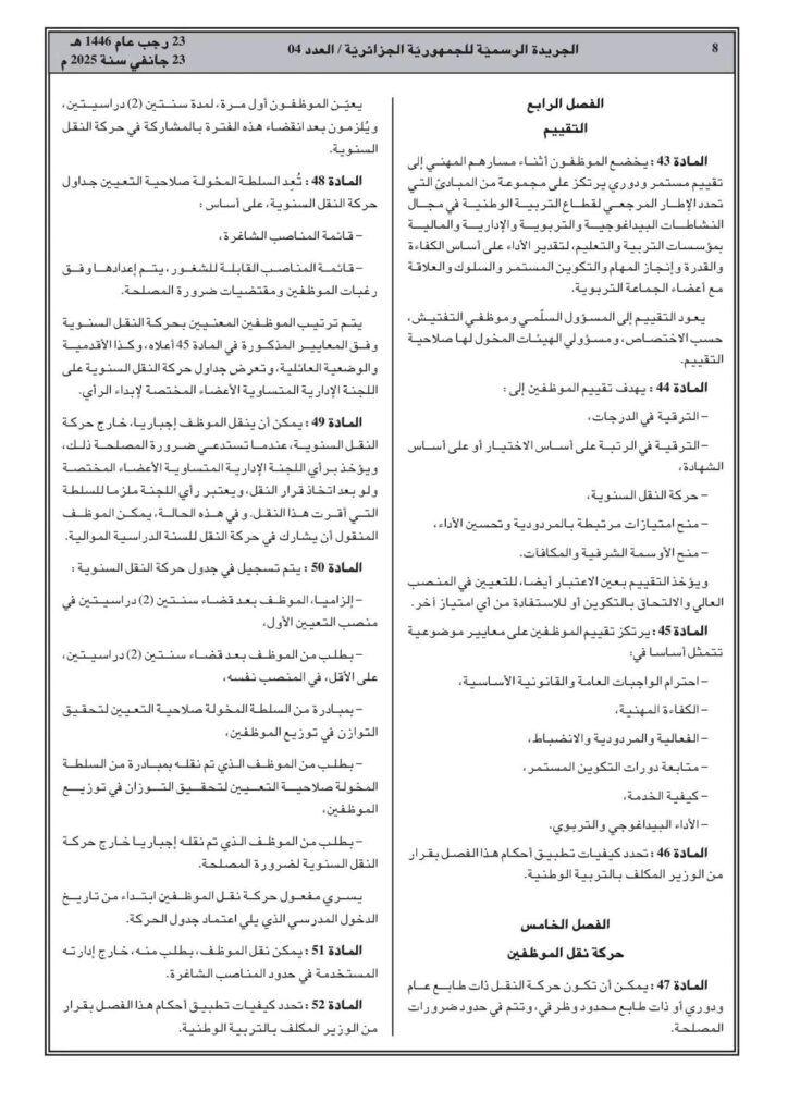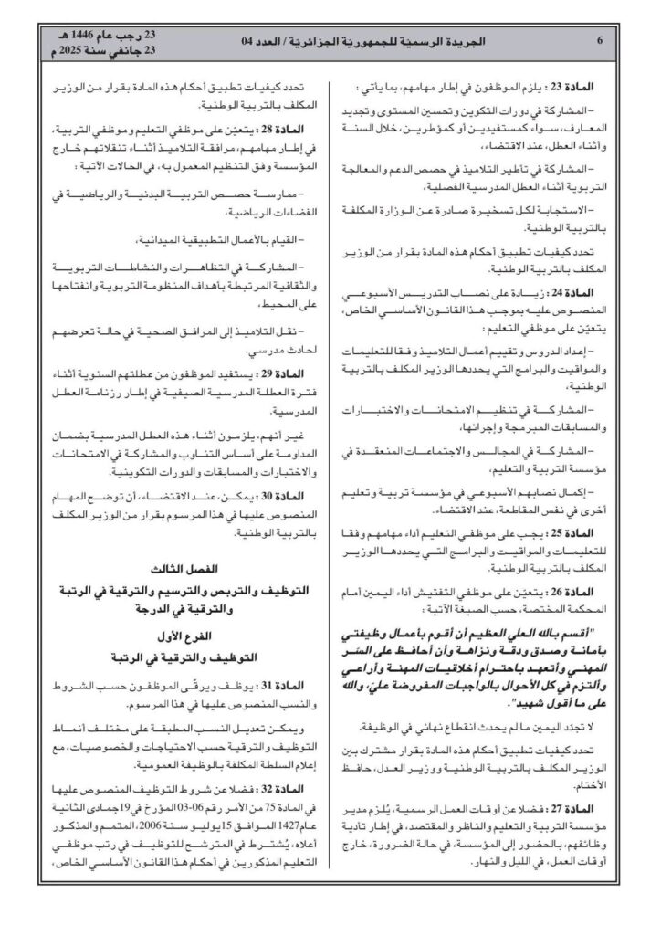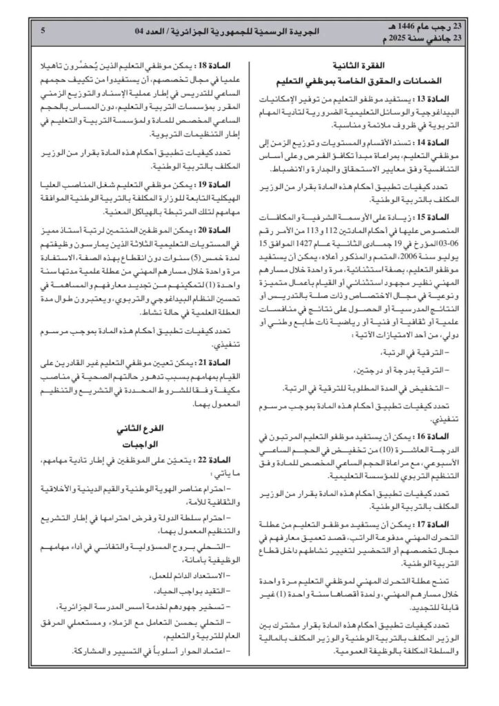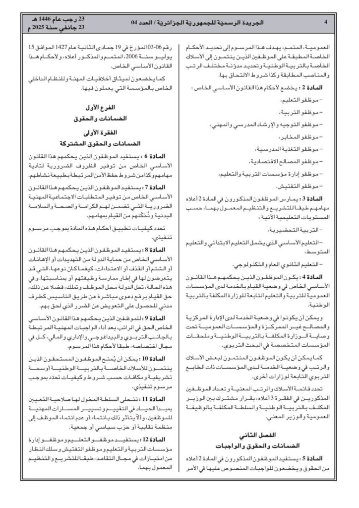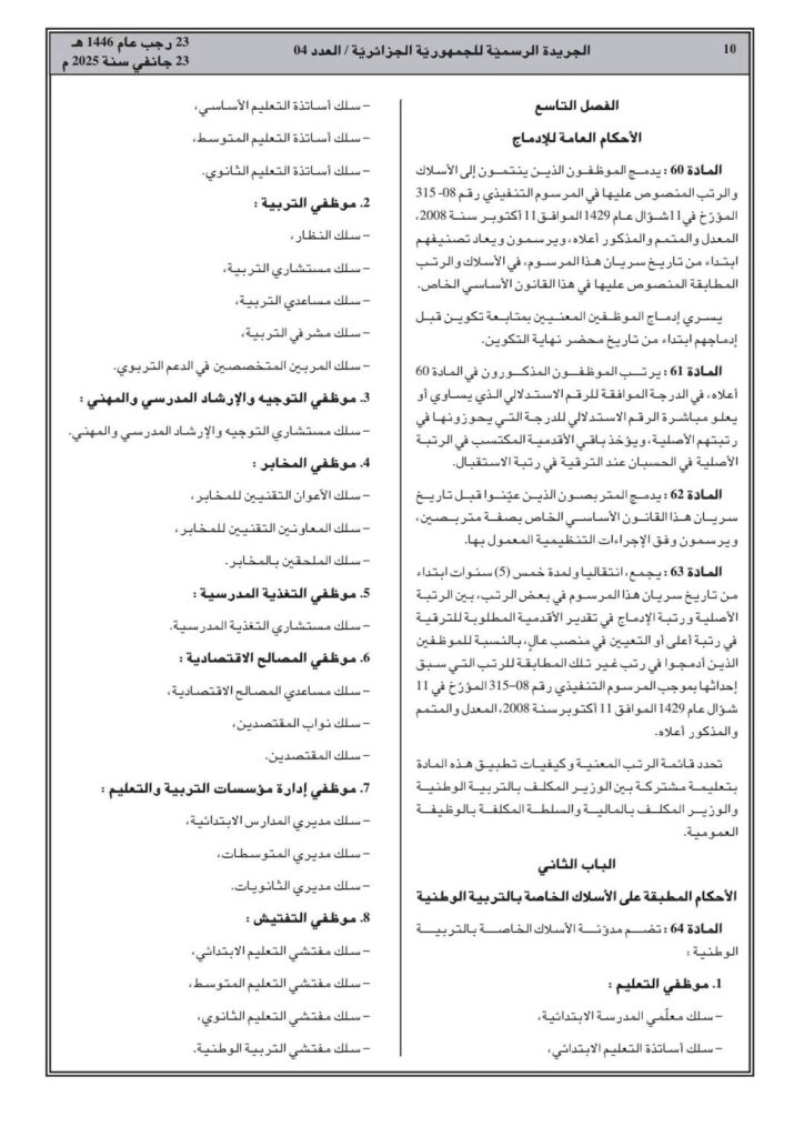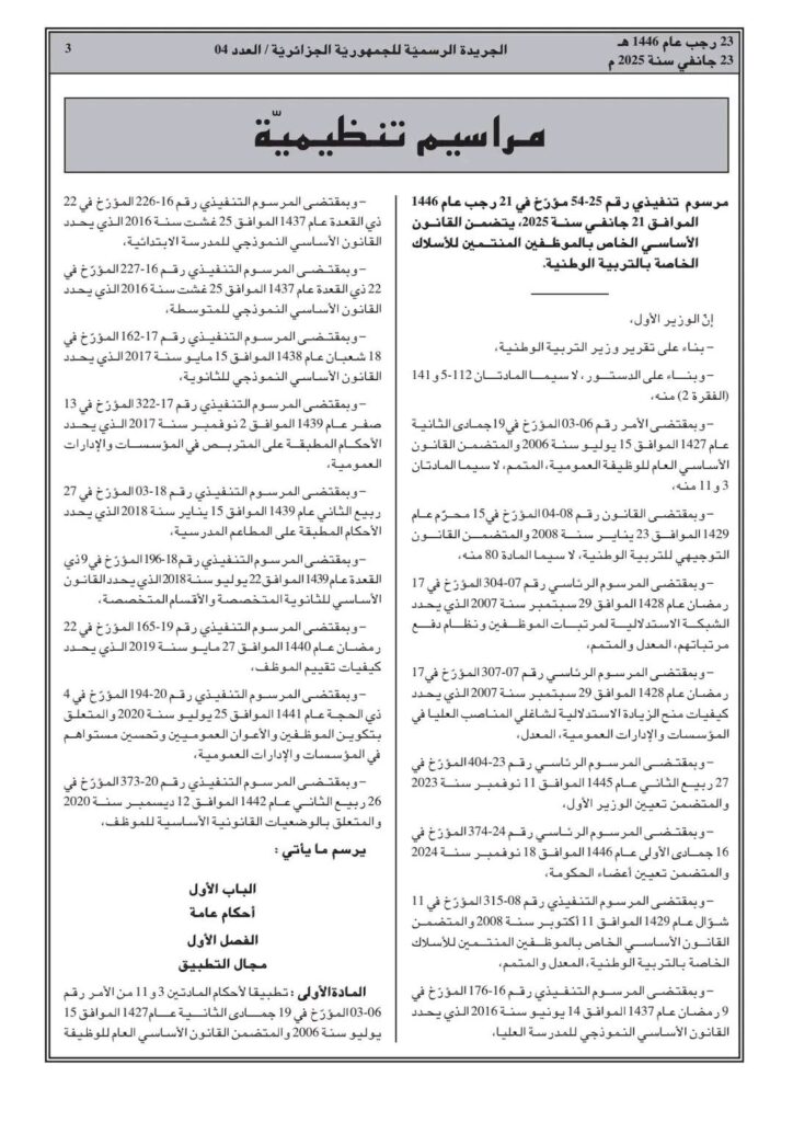 ووفقا للمرسوم التنفيذي رقم 25-54، تم صدور القانون الأساسي الخاص بالموظفين المنتمين للأسلاك الخاصة بالتربية الوطني