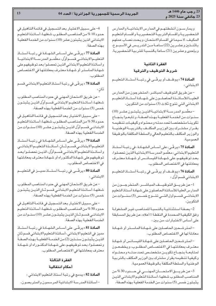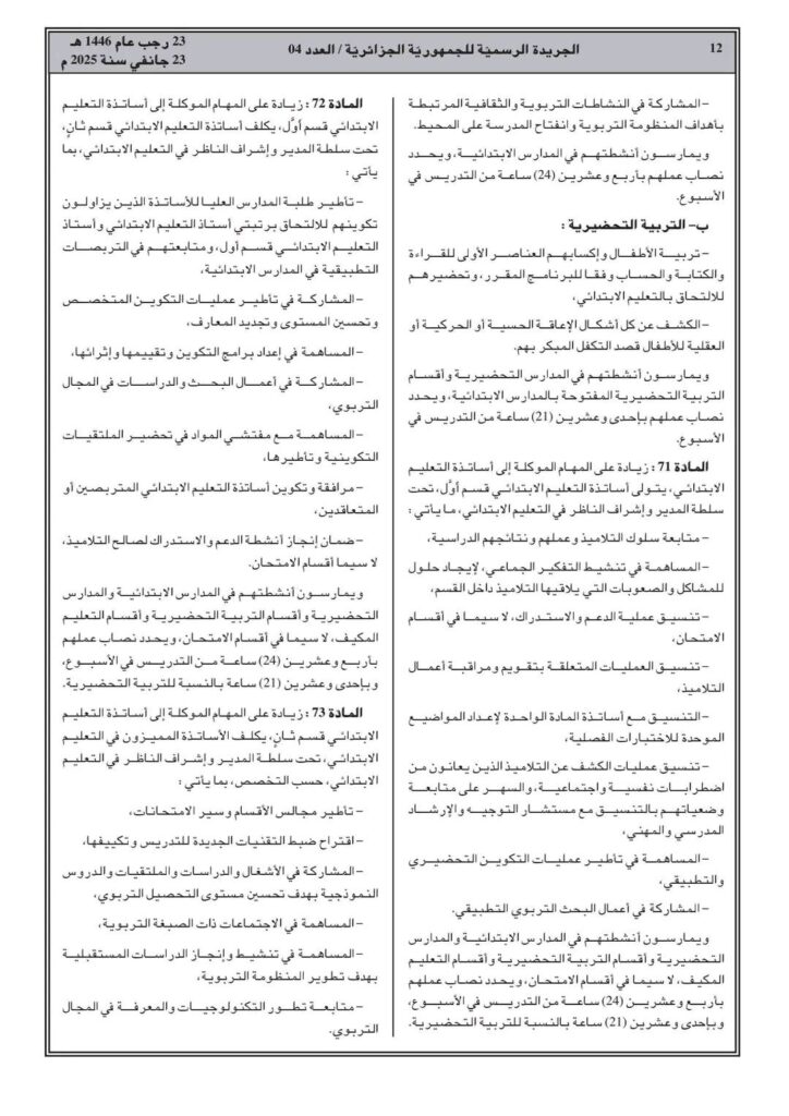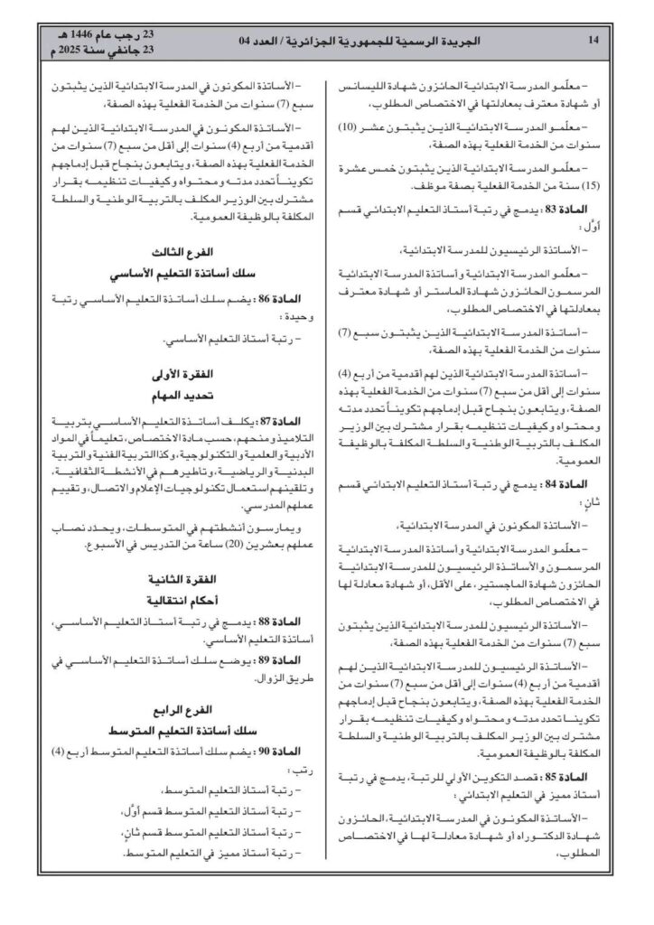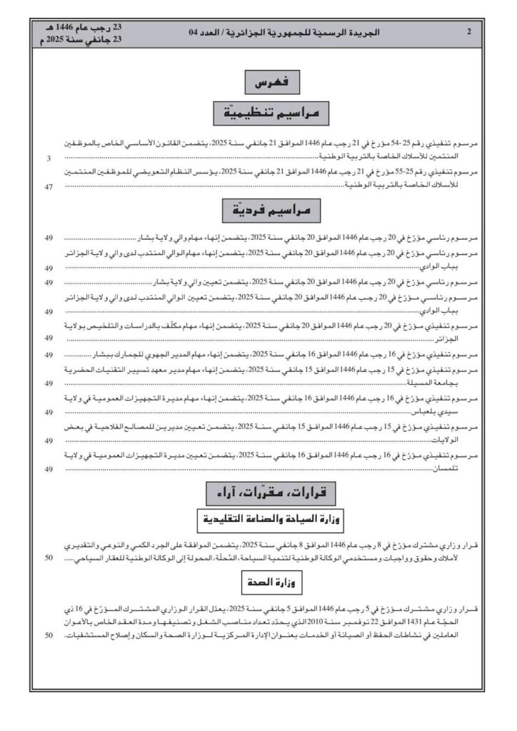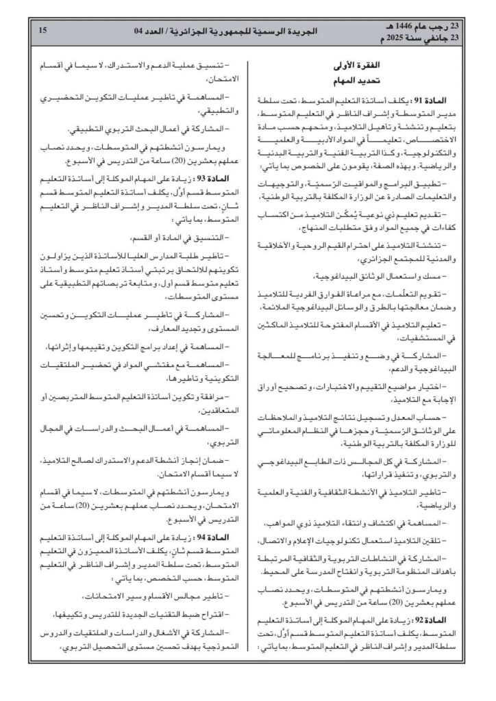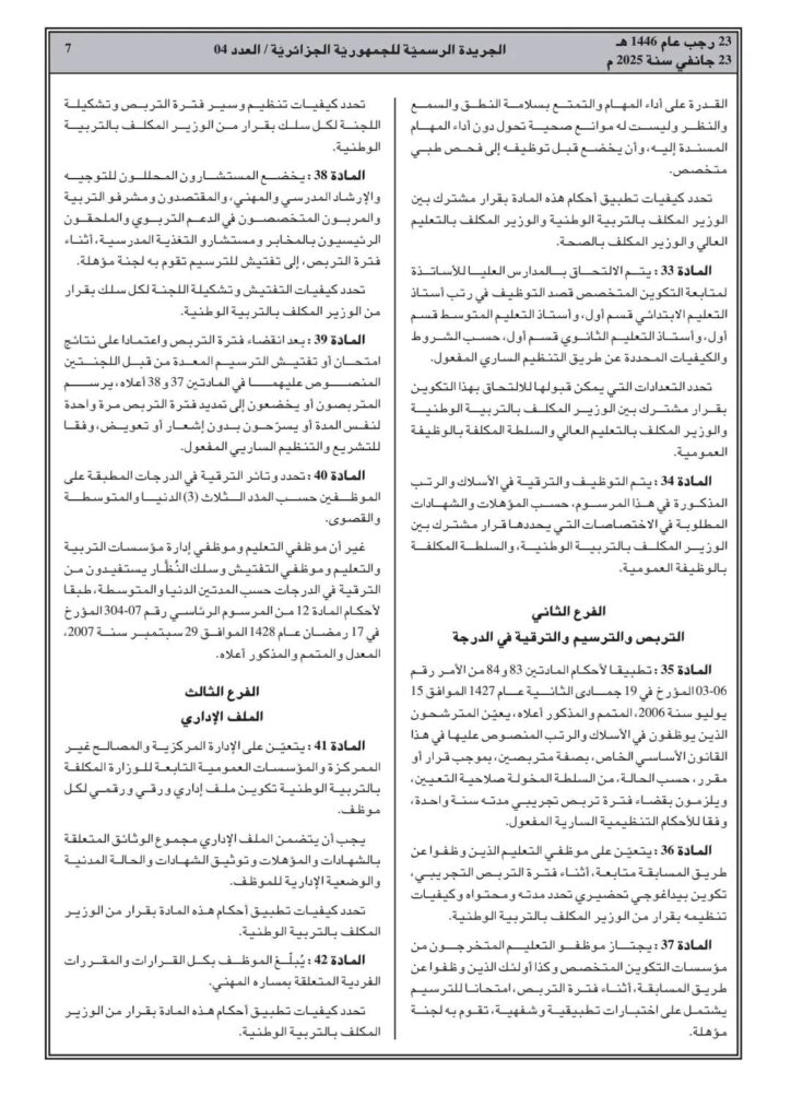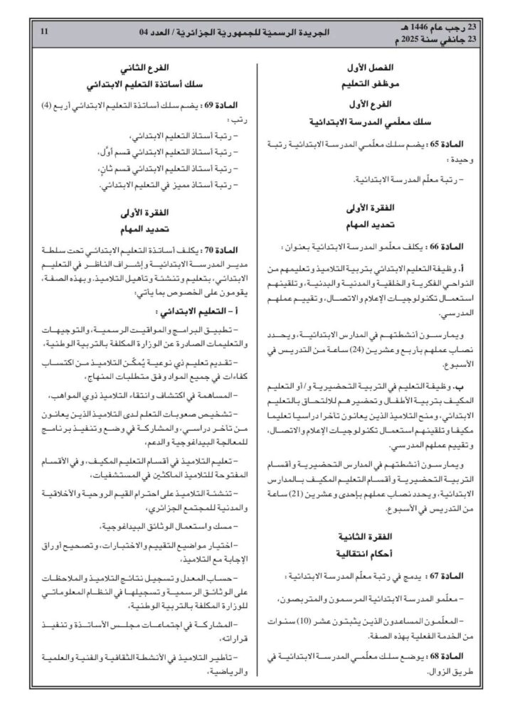 ووفقا للمرسوم التنفيذي رقم 25-54، تم صدور القانون الأساسي الخاص بالموظفين المنتمين للأسلاك الخاصة بالتربية الوطني