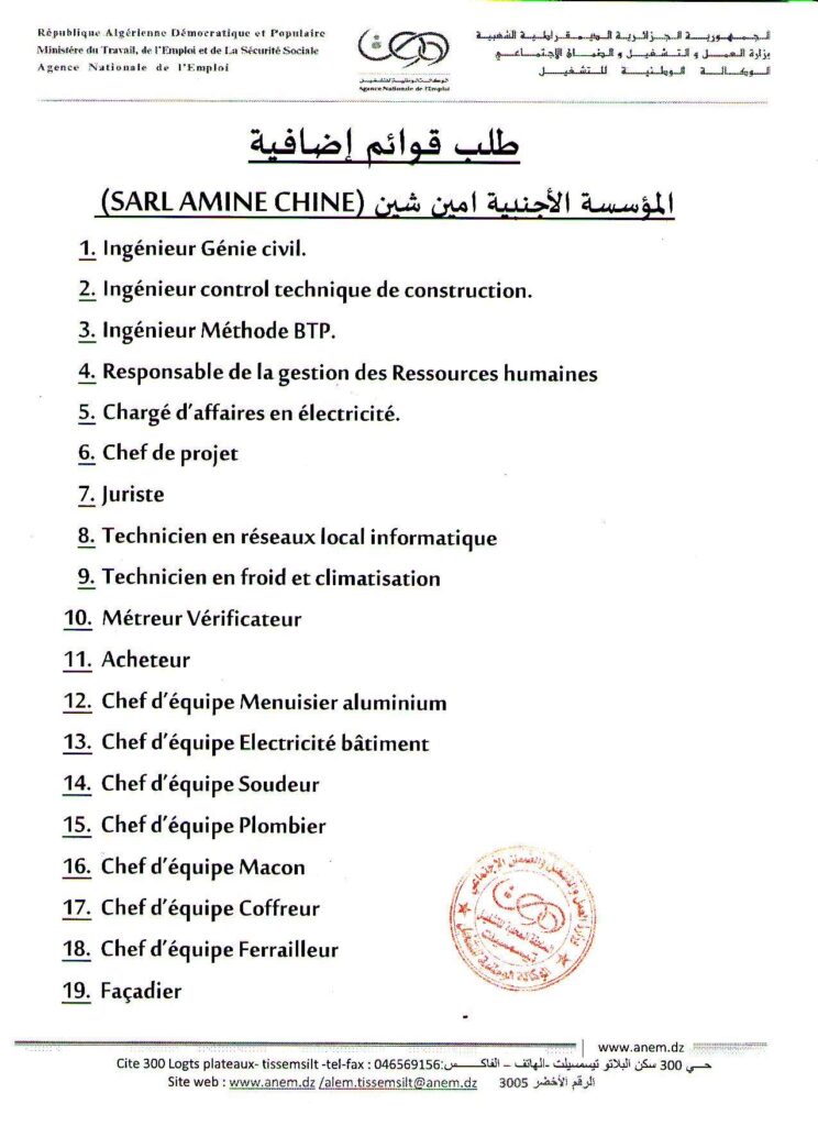 أعلنت مؤسسة الأجنبية أمين شين بولاية تيسمسيلت عن احتياجها لعمال اضافيين