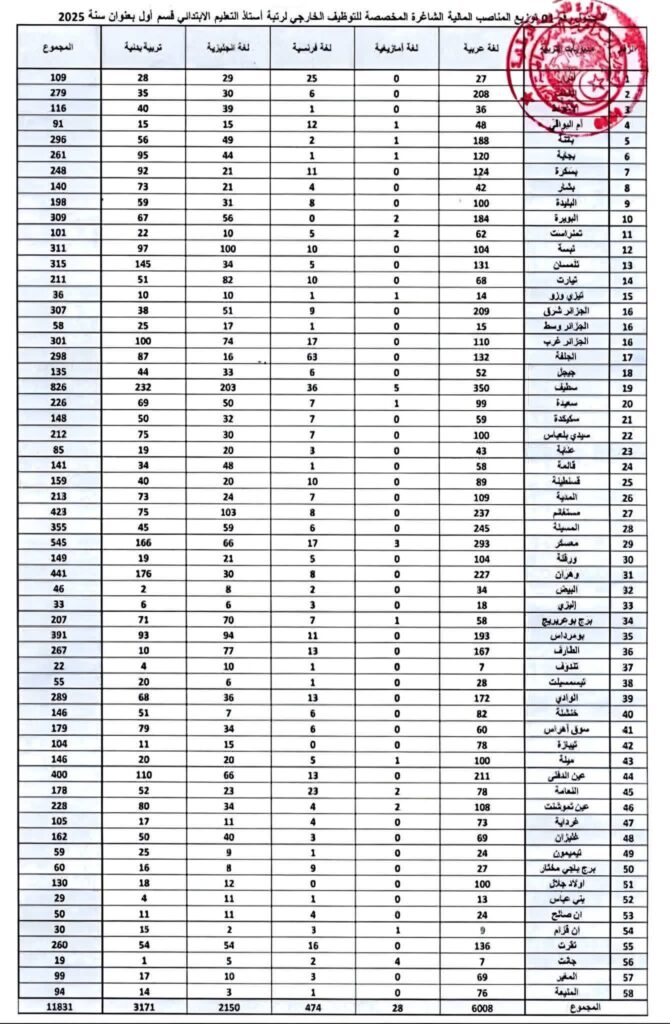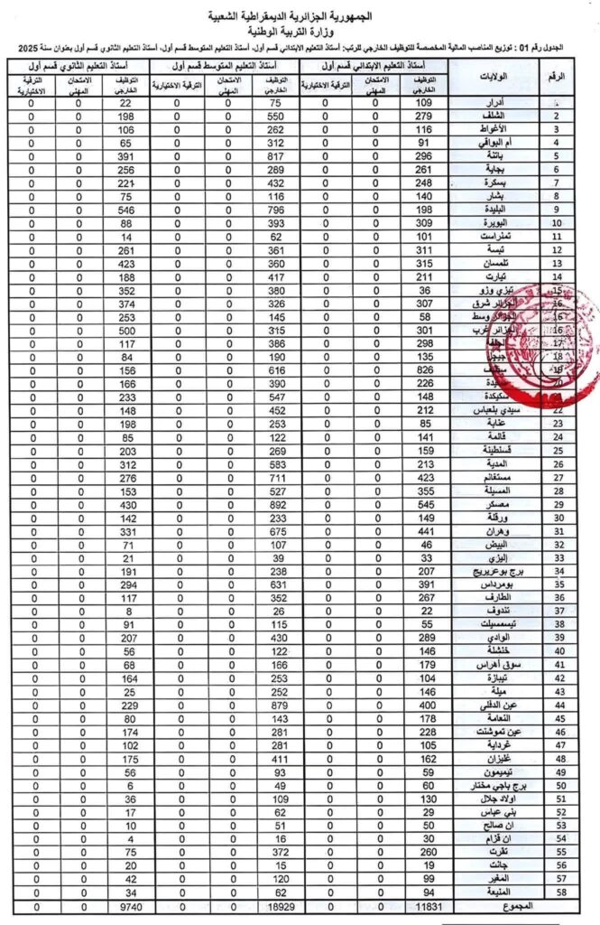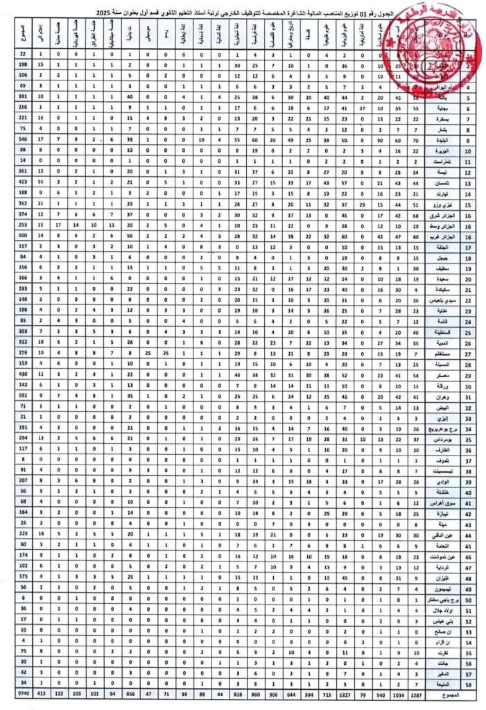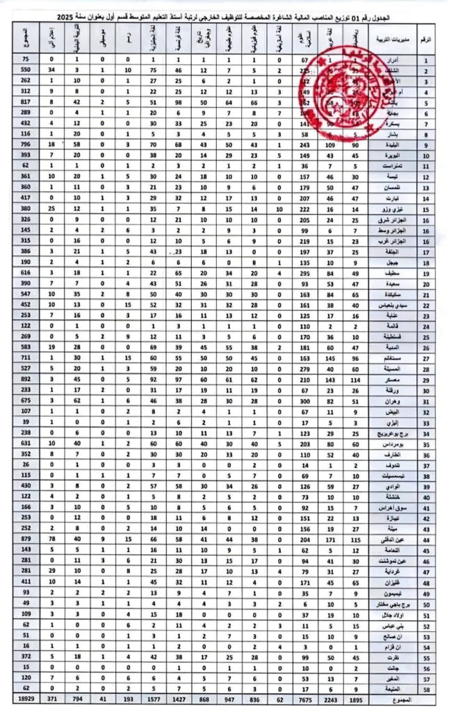 عدد المناصب المخصصة لكل ولاية في مسابقة الأساتذة 2025