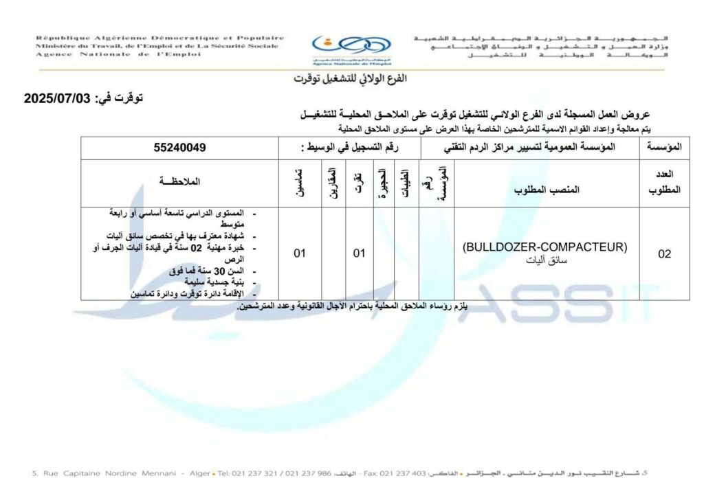 المنصب المطلوب: سائق آليات (BULLDOZER – COMPACTEUR)