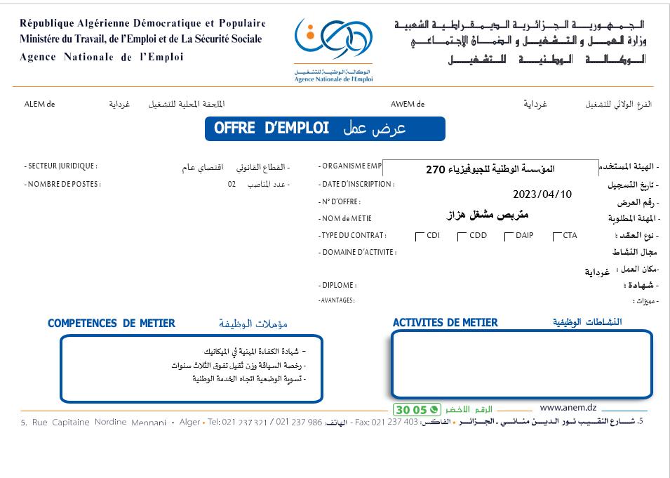 عرض عمل بالمؤسسة الوطنية للجيوفيزياء 270 غرداية