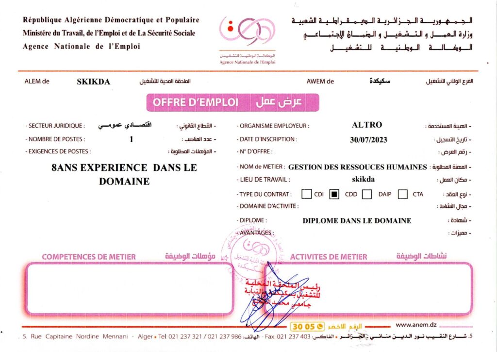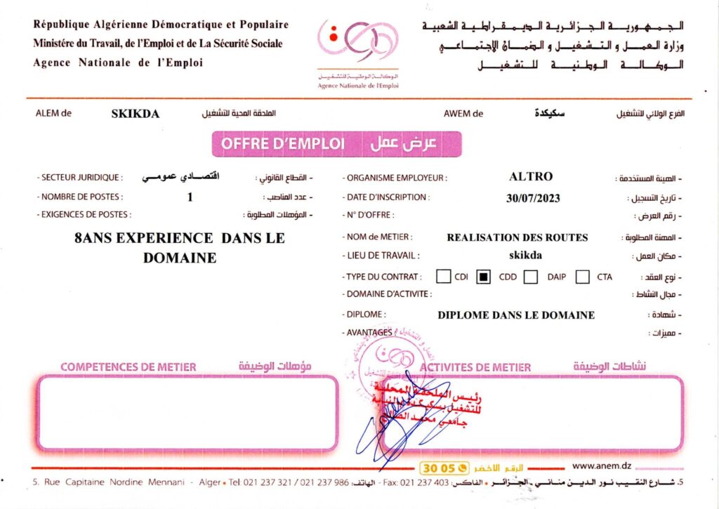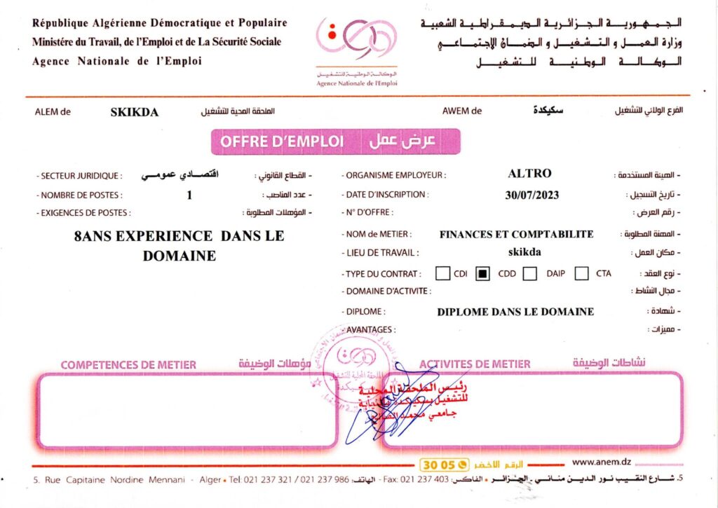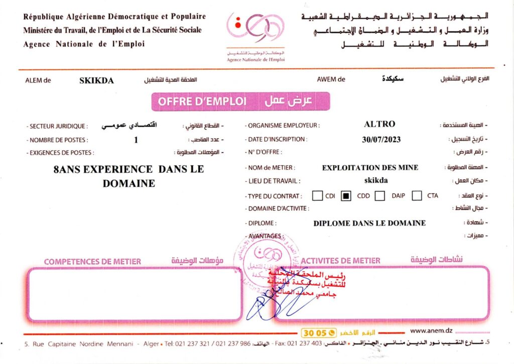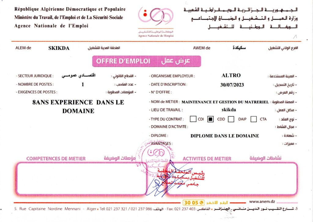 عرض عمل بشركة ألترو ALTRO سكيكدة