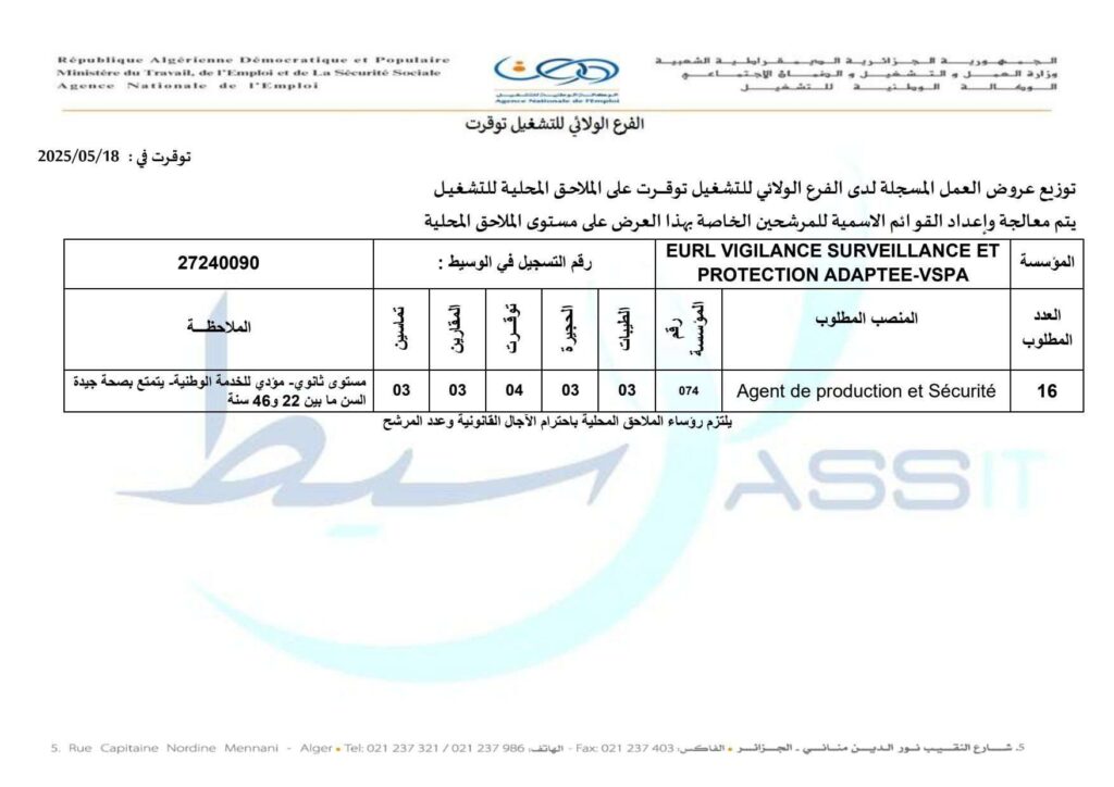 المؤسسة: EURL VIGILANCE SURVEILLANCE ET PROTECTION ADAPTEE – VSPA
