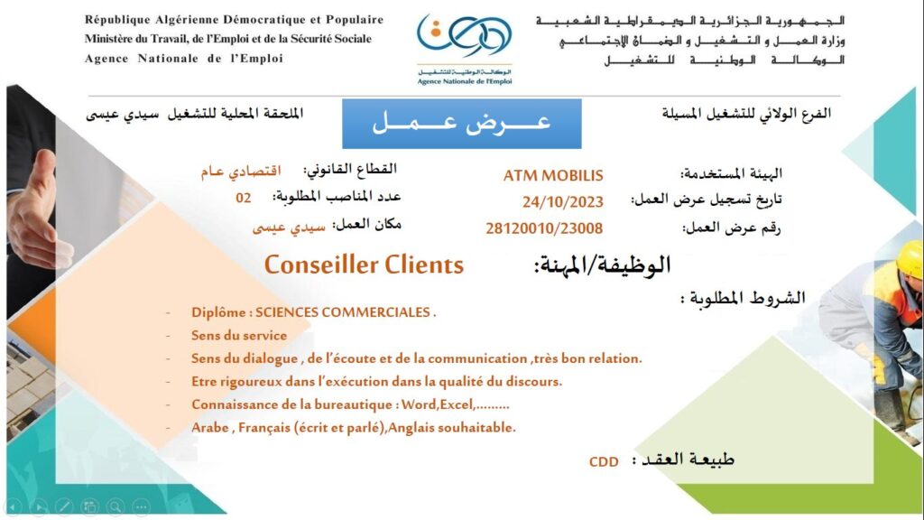 تعلن شركة موبيليس ATM MOBILIS المسيلة سيدي عيسى عن فتح مناصب عمل في التخصصات التالية