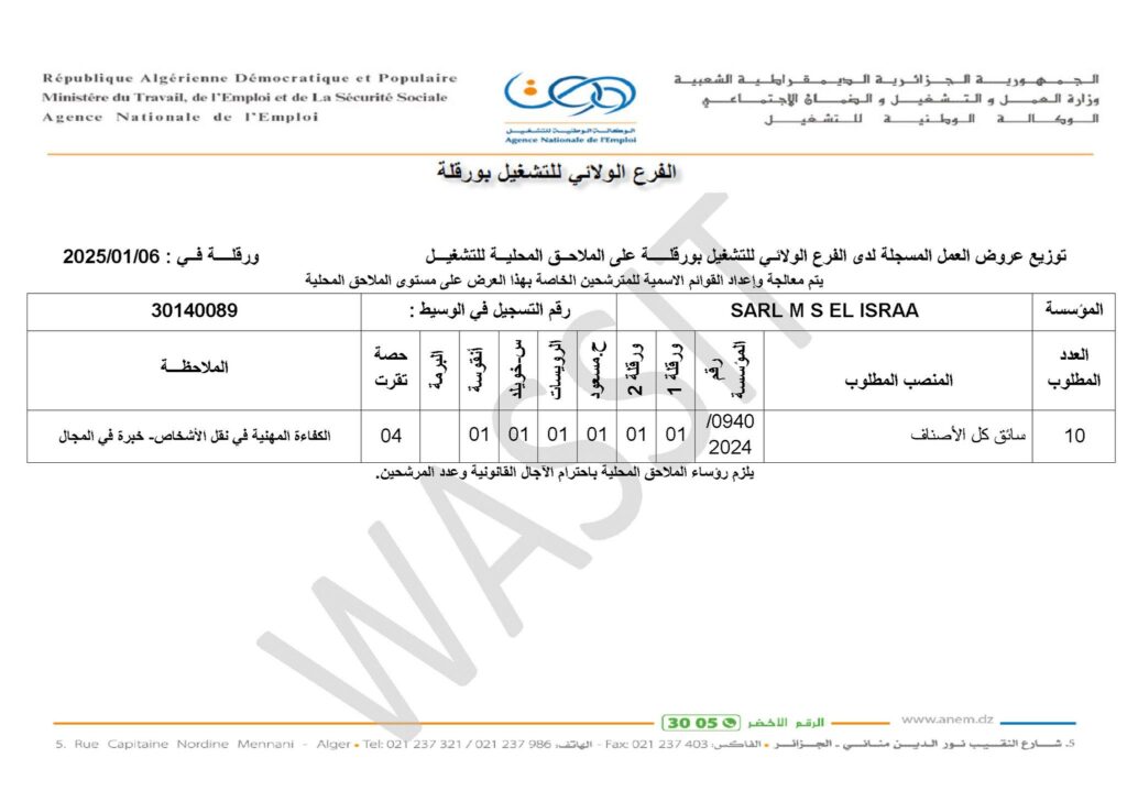 عرض عمل بشركة SARL ISRAA سائقين جميع الأصناف