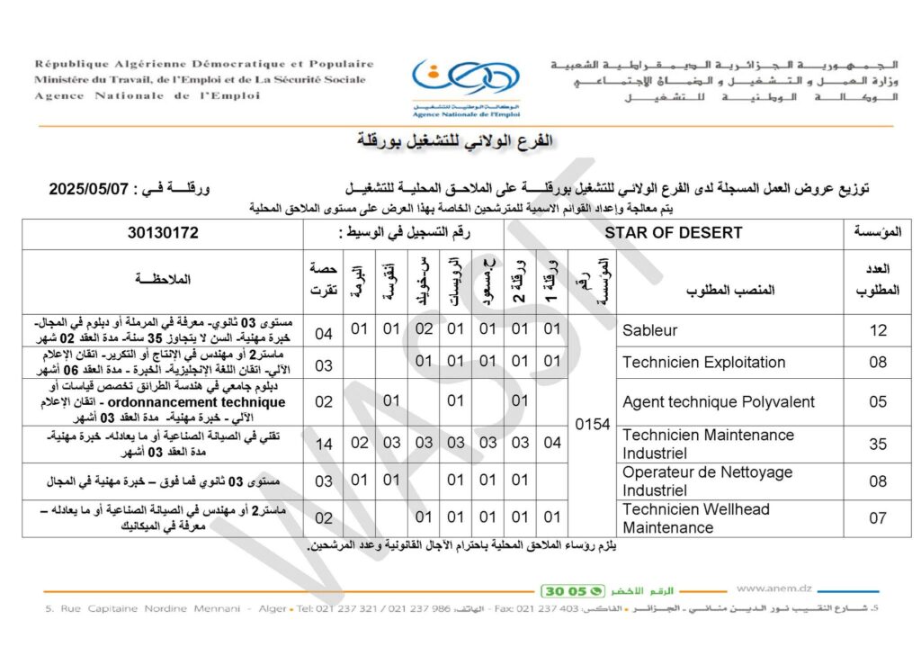 Agent Technique Polyvalent | 05 | أنقوسة، تقرت، حاسي مسعود، البرمة، سيدي خويلد | دبلوم جامعي في هندسة الطرائق/القياسات أو برمجة تقنية – خبرة – عقد: 3 أشهر |