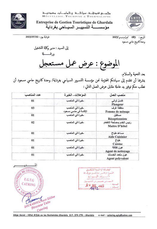 تعلن مؤسسة التسيير السياحي بغرداية ولاية ورقلة عن فتح مناصب في مجال الاطعام والخدمات والفندقة
