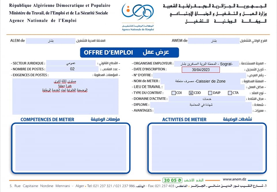عرض عمل بمحطة البرية للمسافرين بشار SOGRAL