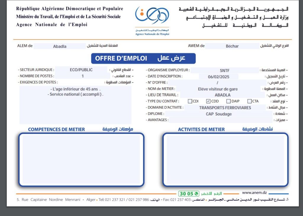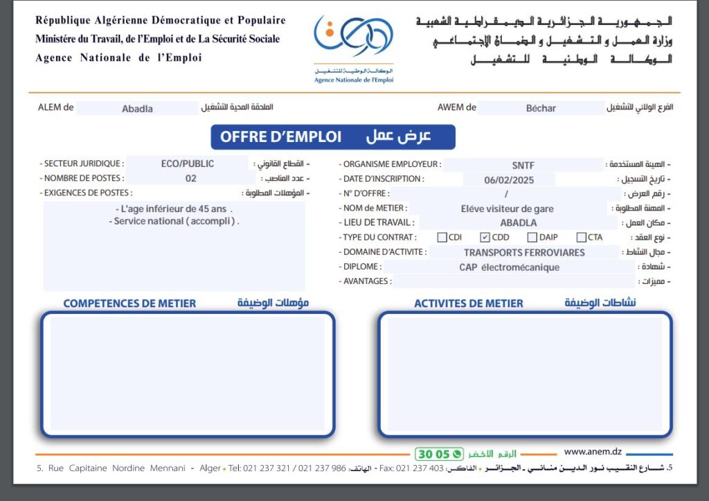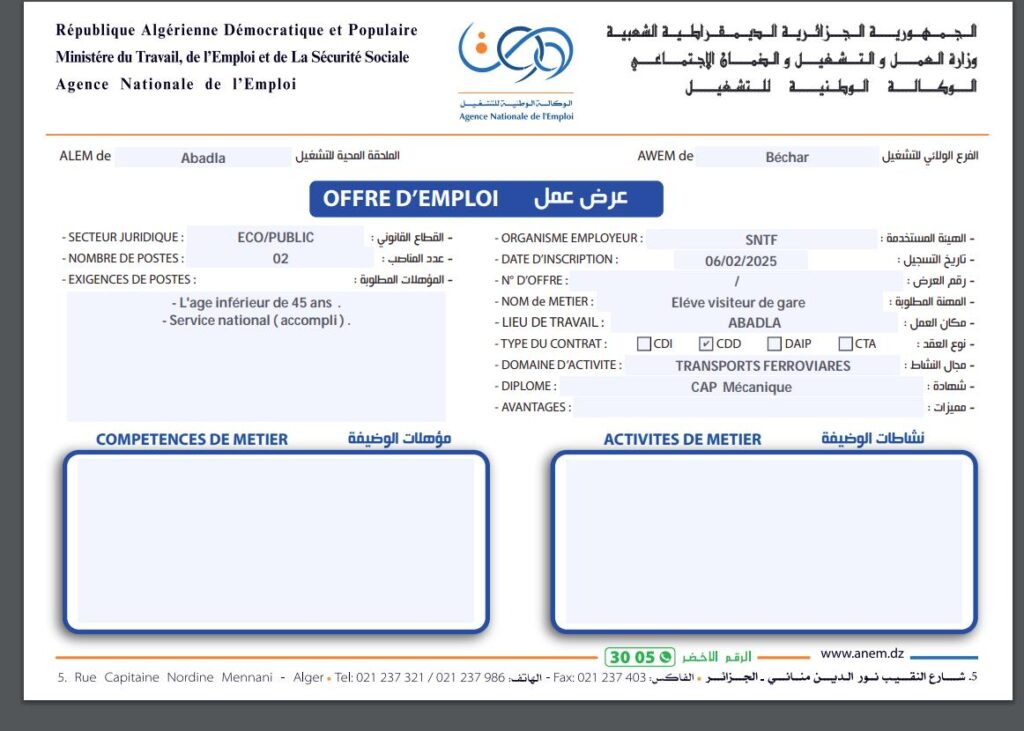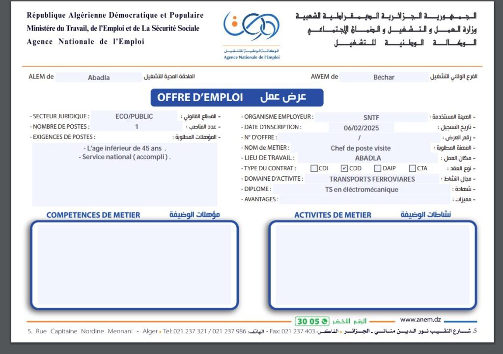 تعلن المؤسسة الوطنية للنقل بالسكك الحديدية SNTF عن فتح مناصب عمل بولاية بشار في التخصصات التالية