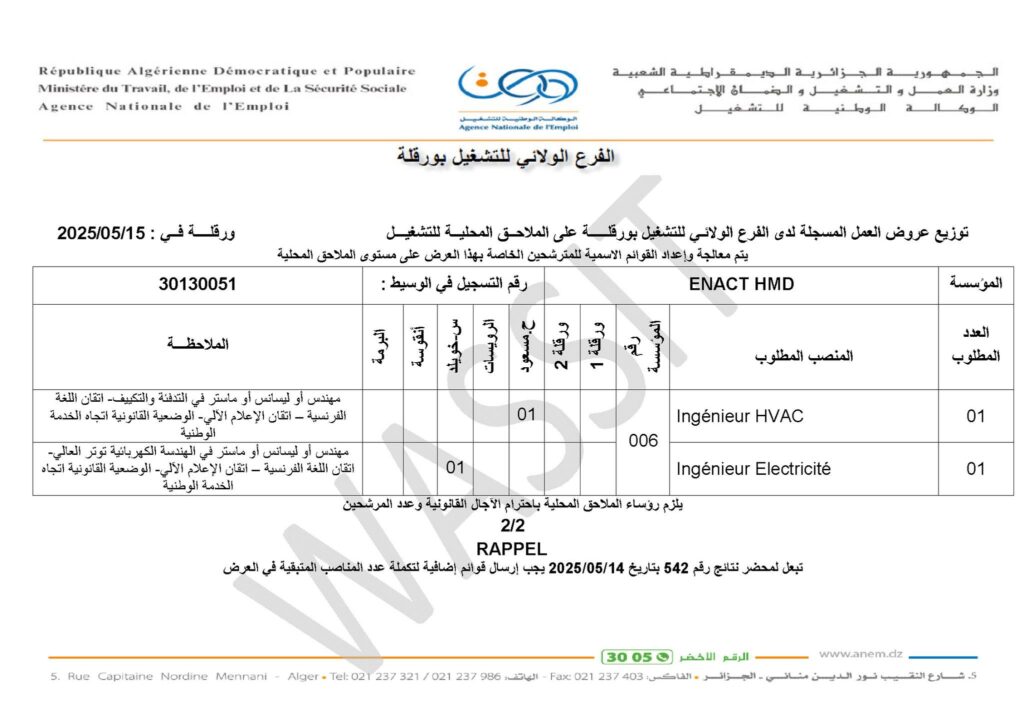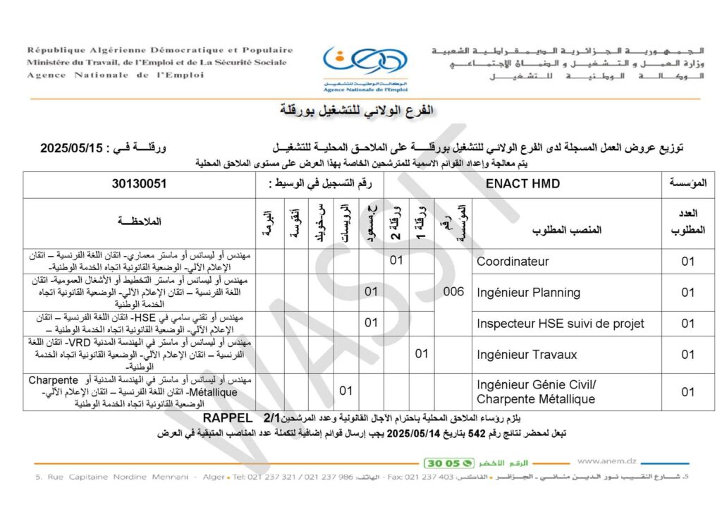 تعلن المؤسسة الوطنية للاعتماد والمراقبة التقنية enact بحاسي مسعود عن فتح مناصب عمل في التخصصات التالية