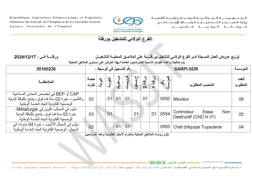 تعلن شركة صاربي SARPI بحاسي مسعود عن فتح مناصب عمل في التخصصات التالية