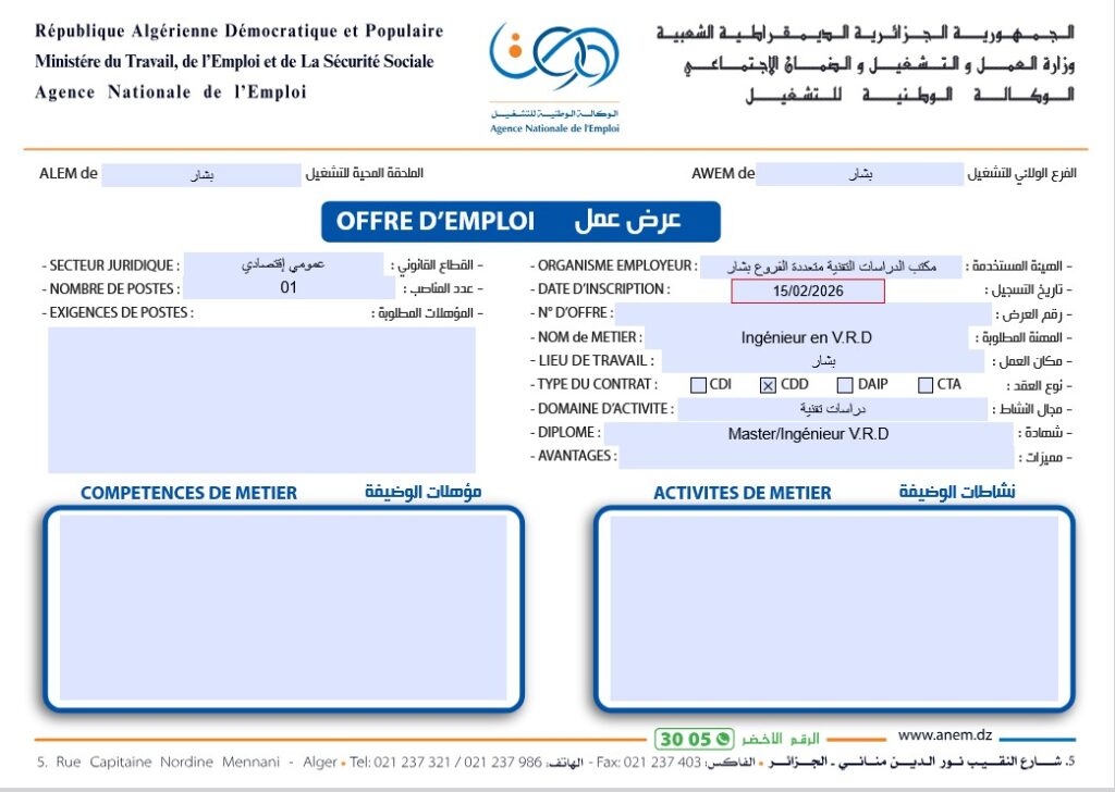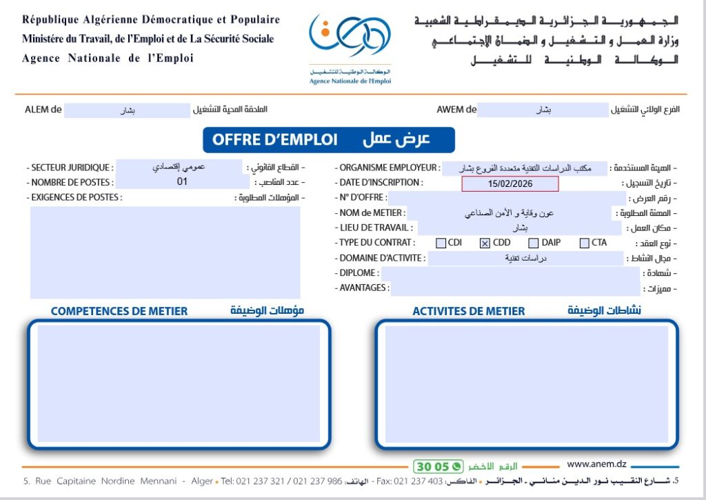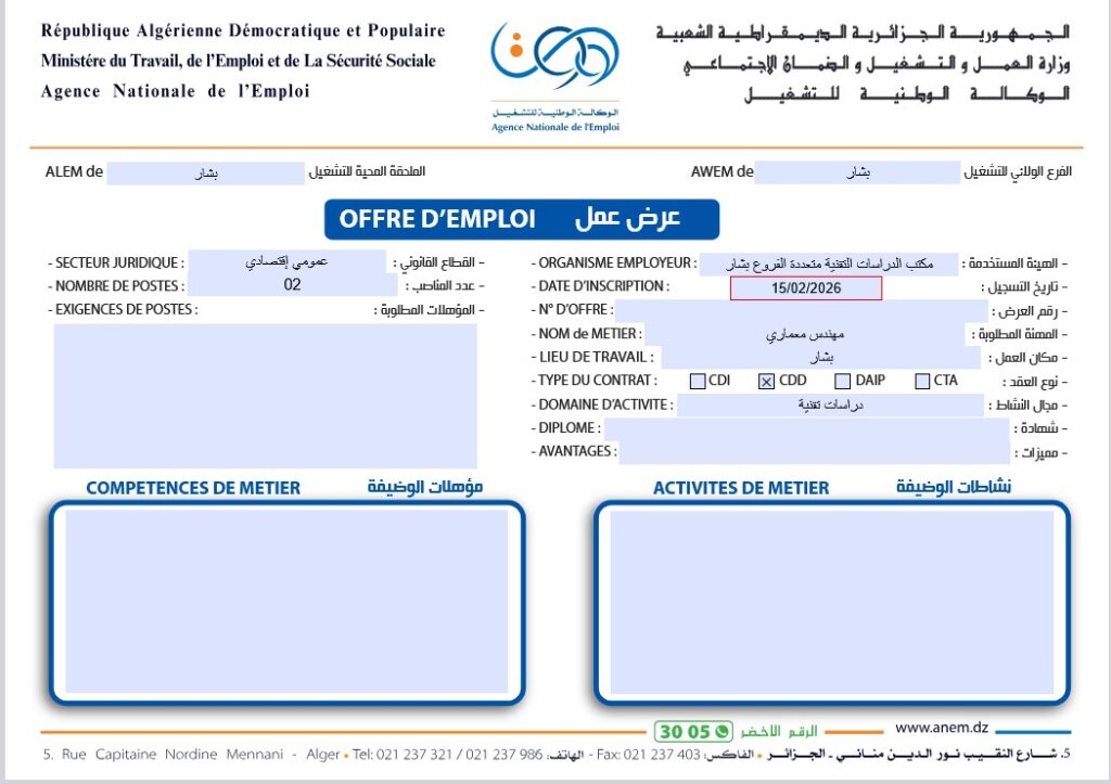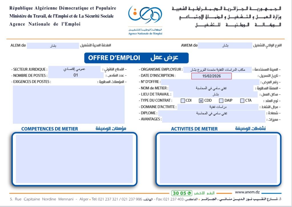 قائمة بالوظائف المطلوبة الصادرة عن الوكالة الوطنية للتشغيل (ANEM) لولاية بشار بتاريخ 15/02/2026:
