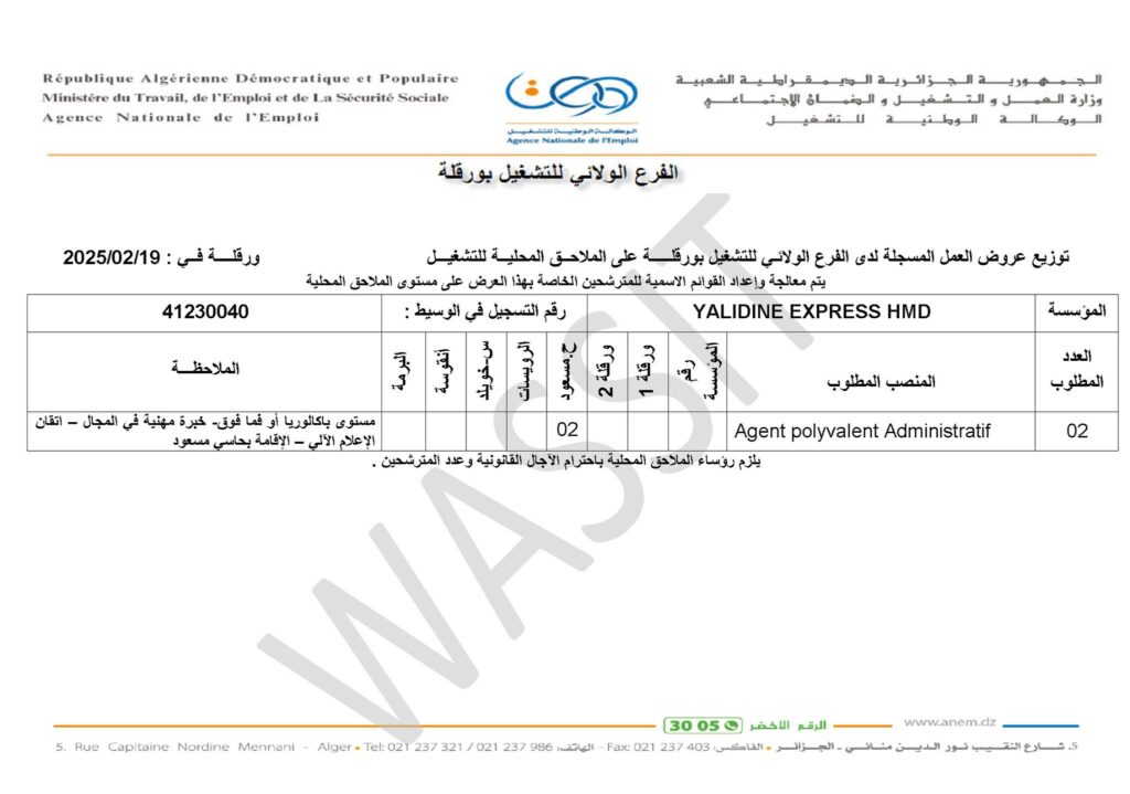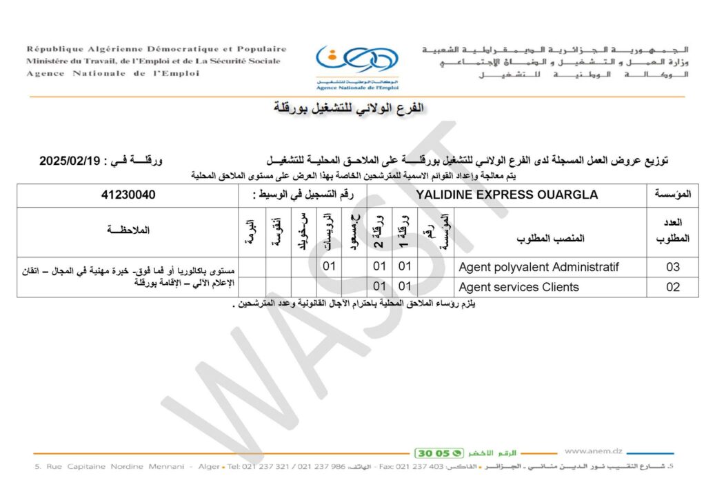 تعلن شركة ياليدين اكسبريس عن فتح مناصب عمل بورقلة في التخصصات التالية