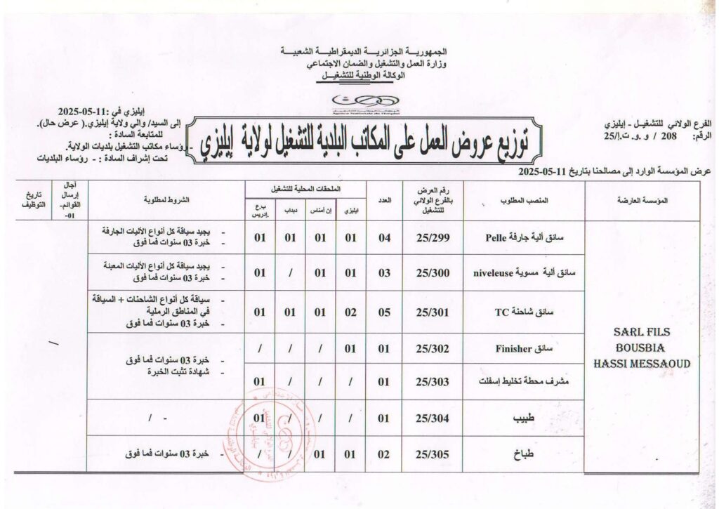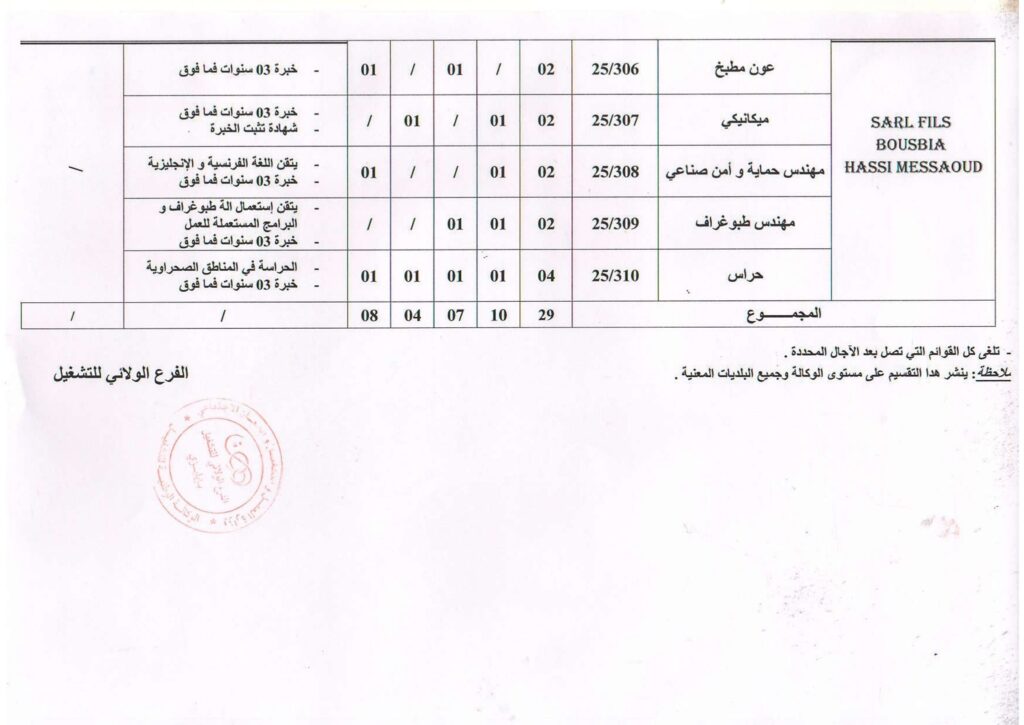 عروض عمل في شركة SARL FILS BOUSBIA حاسي مسعود 29 منصب