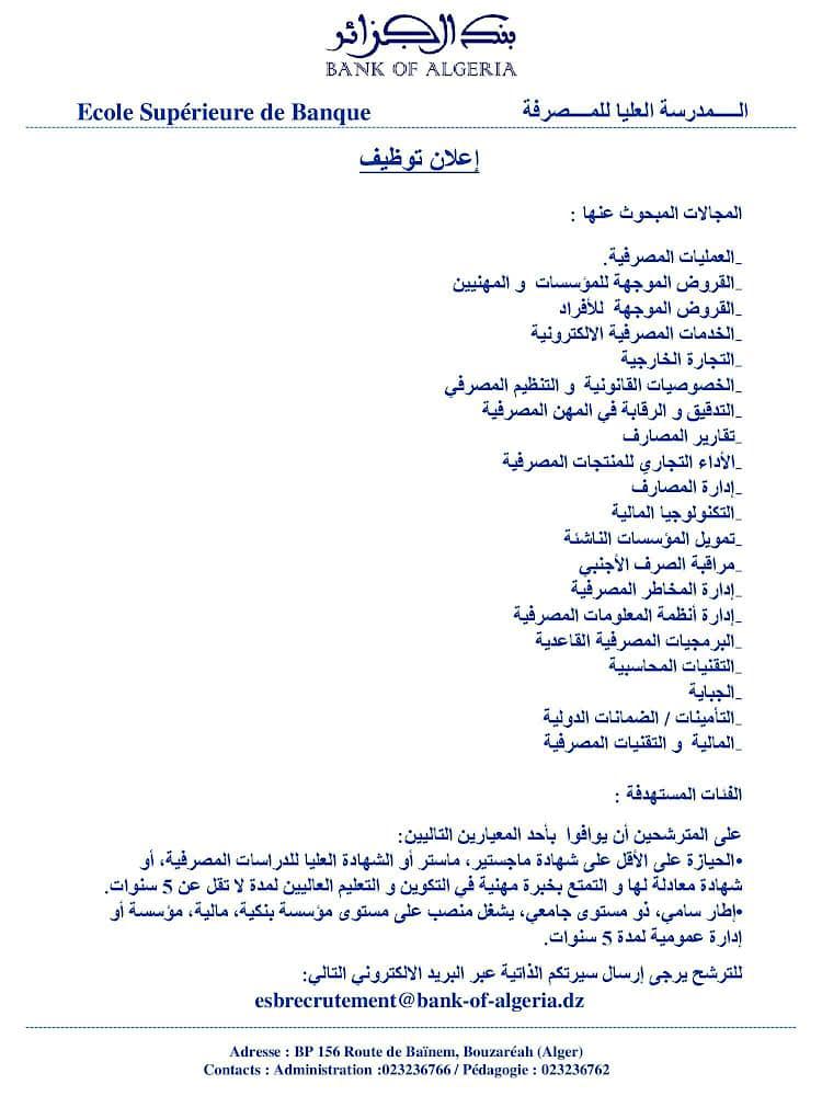 التقديم عبر البريد الالكتروني esbrecrutment@bank-of-algeria.dz