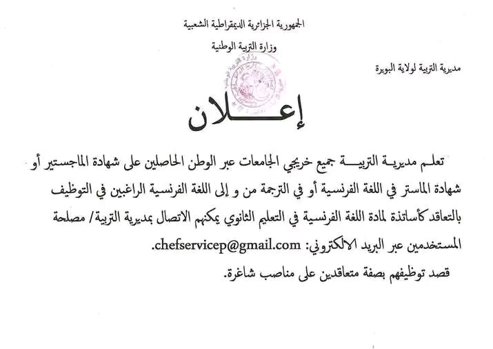 تعلن مديرية التربية لولاية البويرة عن فتح باب التسجيل للتوظيف بالتعاقد في سلك أساتذة التعليم الثانوي لمادة اللغة الفرنسية.