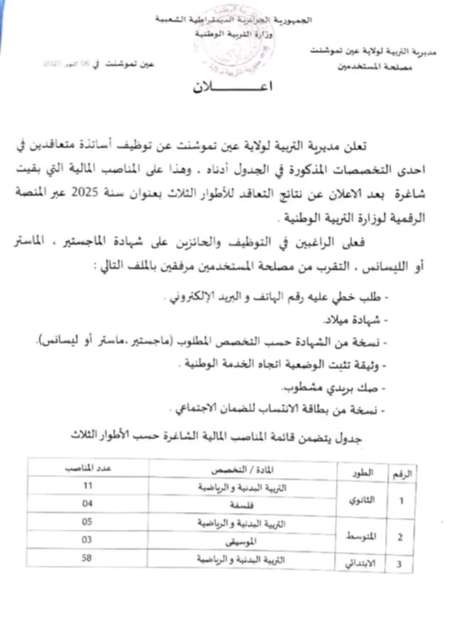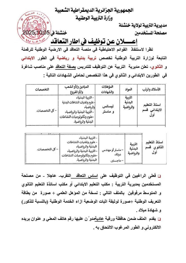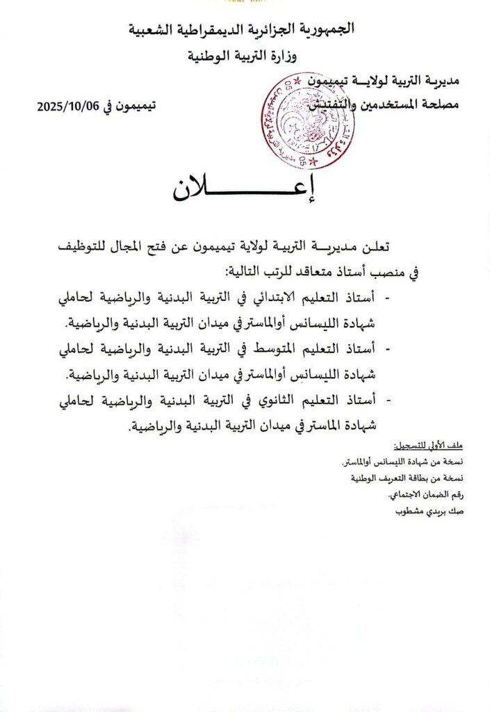 تُعلن مديريات التربية لولايات خنشلة، عين تموشنت، وتيميمون عن فتح باب التوظيف بالتعاقد في الأطوار التعليمية الثلاث (ابتدائي – متوسط – ثانوي)، لفائدة حاملي شهادات الليسانس، الماستر، المهندس، والماجستير في ميدان التربية البدنية والرياضية وبعض التخصصات الأخرى.