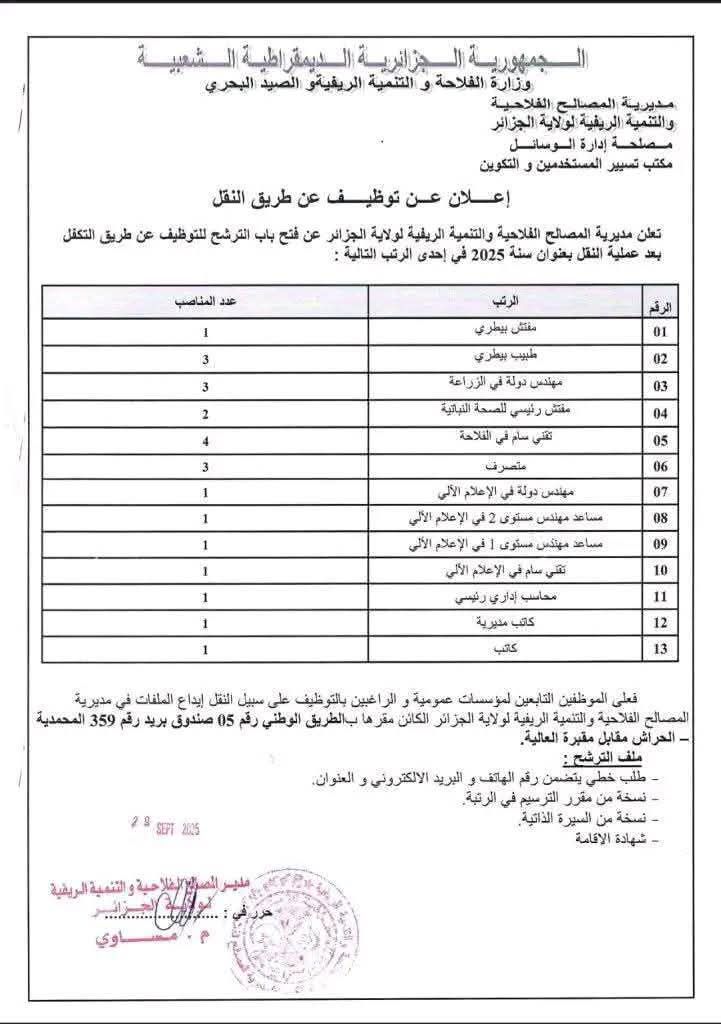 تعلن مديرية المصالح الفلاحية والتنمية الريفية لولاية الجزائر عن فتح باب الترشح للتوظيف عن طريق التكفل بعد عملية النقل بعنوان سنة 2025 في إحدى الرتب التالية: