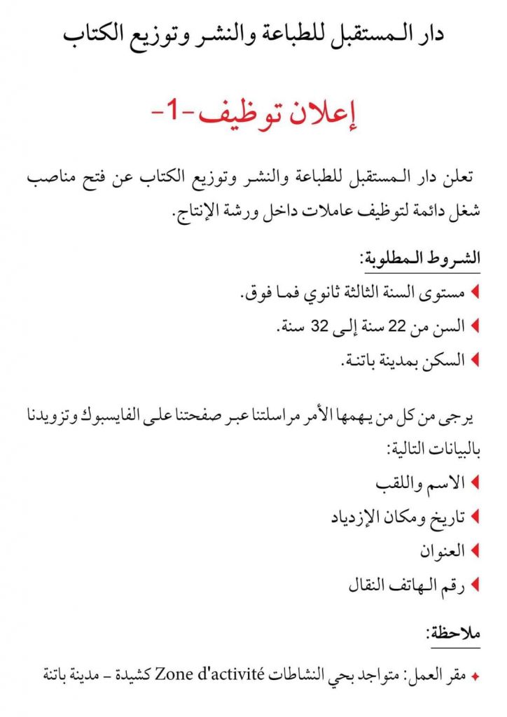 تعلن دار المستقبل للطباعة والنشر وتوزيع الكتب عن فتح مناصب شغل دائمة لتوظيف عاملات داخل ورشة الإنتاج.