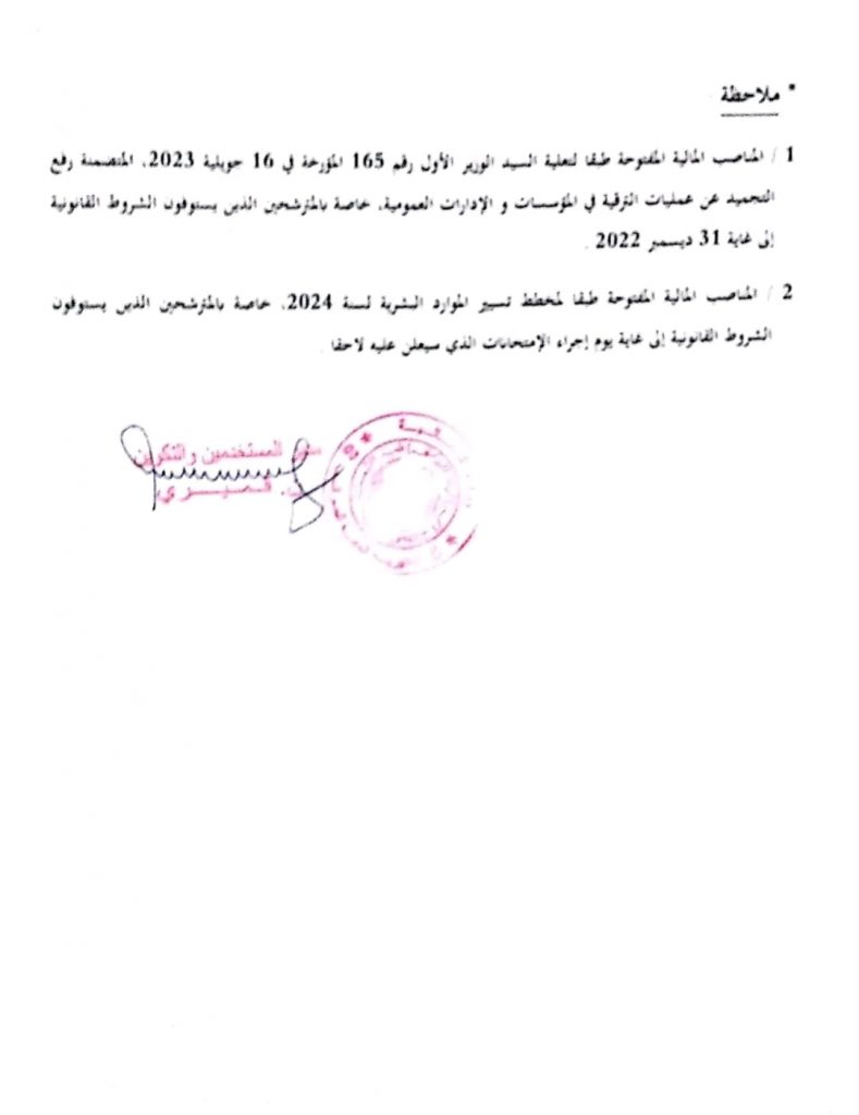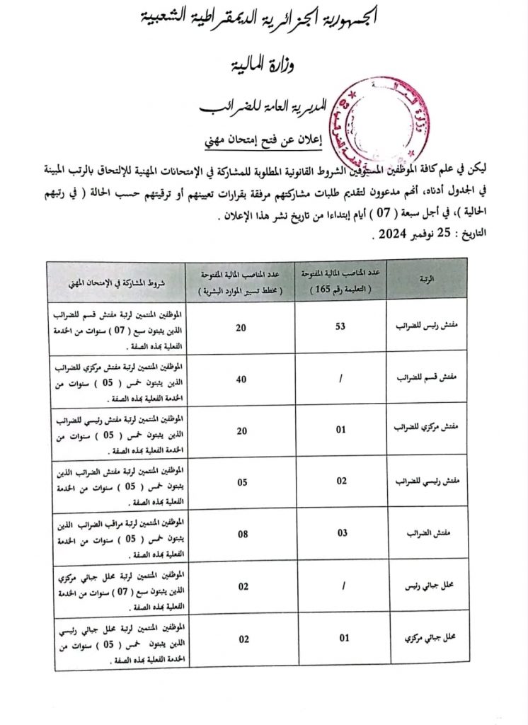 ليكن في علم كافة الموظفين المستوفين الشروط القانونية المطلوبة للمشاركة في الإمتحانات المهنية للإلتحاق بالرتب المبينة في الجدول أدناه، أنهم مدعوون لتقديم طلبات مشاركتهم مرفقة بقرارات تعيينهم أو ترقيتهم حسب الحالة ( في رتبهم الحالية )، في أجل سبعة ( 07 ) أيام إبتداءا من تاريخ نشر هذا الإعلان.