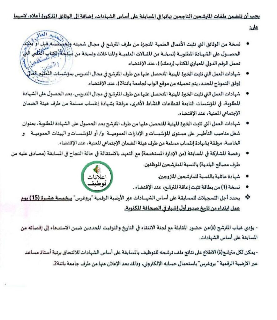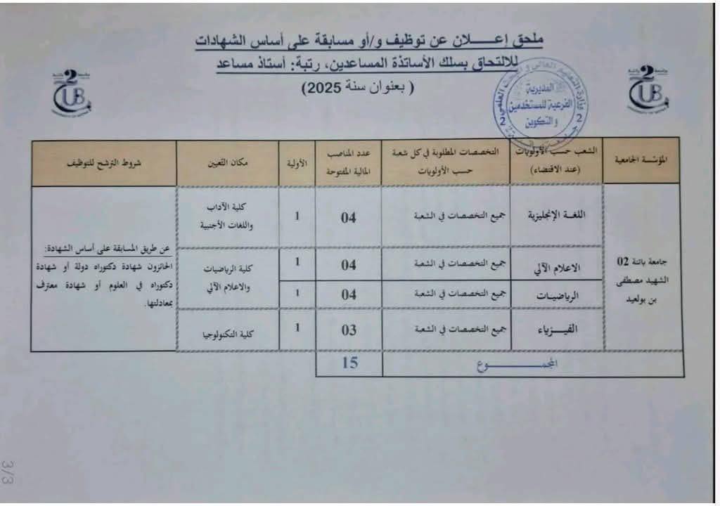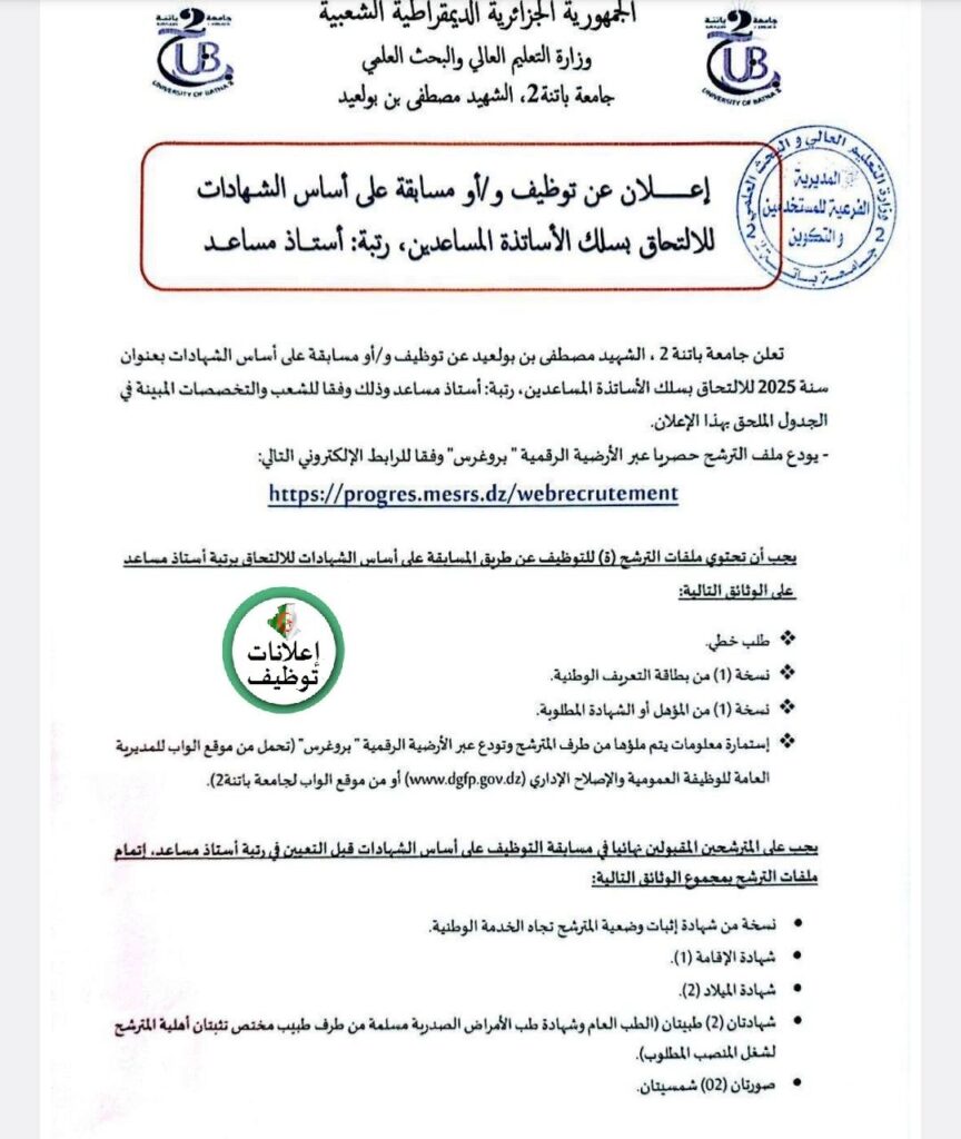 تعلن جامعة باتنة 2، عن فتح مسابقات توظيف على اساس الشهادات للالتحاق بسلك الأساتذة المساعدين رتبة أستاذ مساعد قسم ب في الشعب التالية
