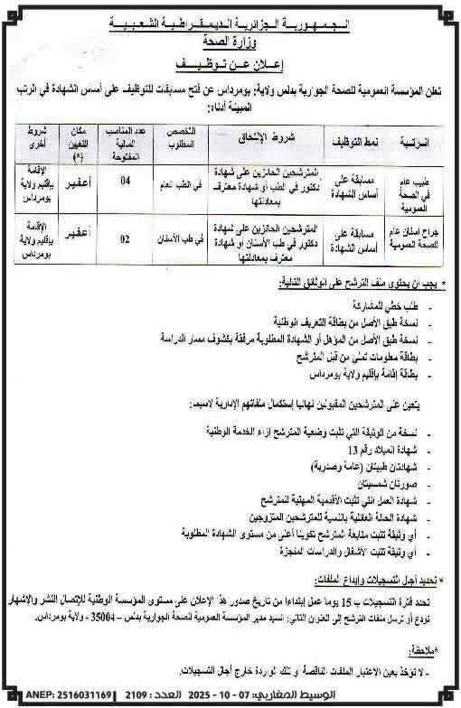 العنوان: مدير المؤسسة العمومية للصحة الجوارية بدلس – ولاية بومرداس.