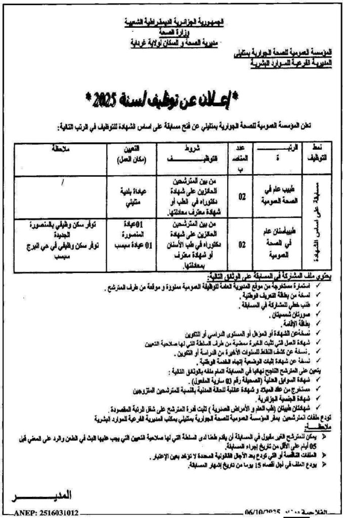 تعلن عدد من المؤسسات الصحية العمومية عن فتح مسابقات توظيف على أساس الشهادة في مختلف ولايات الوطن، وفق التفاصيل التالية: