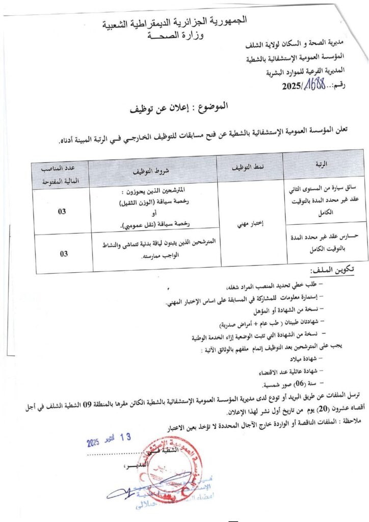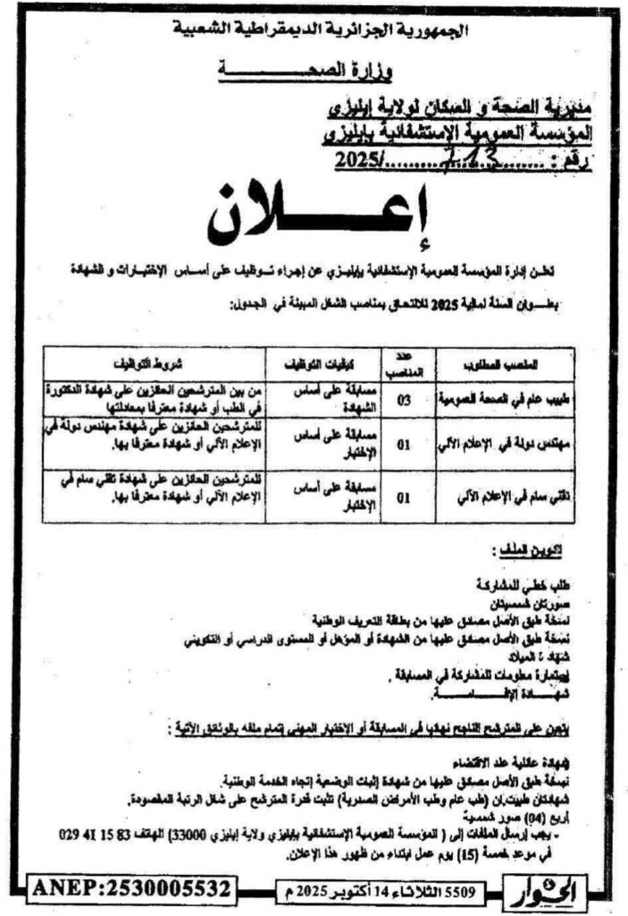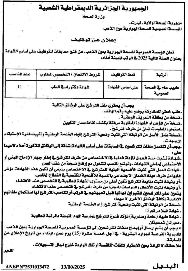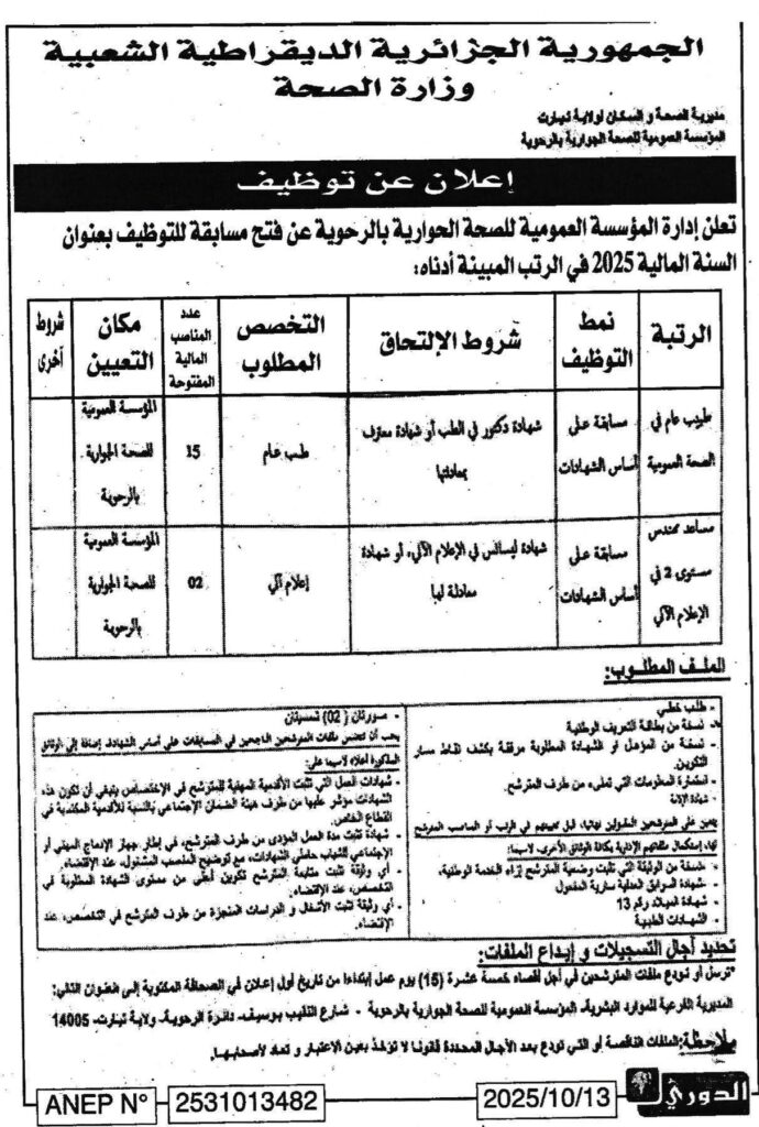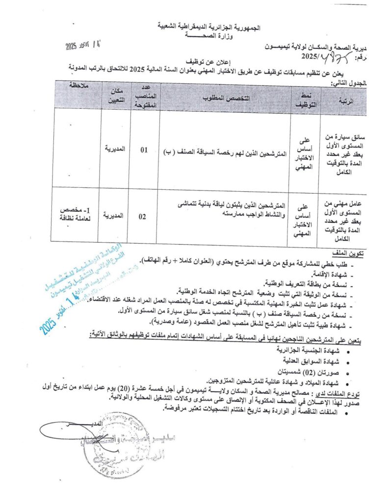 تعلن مديرية الصحة والسكان عن فتح مسابقات للتوظيف على أساس الشهادة بعنوان السنة المالية 2025