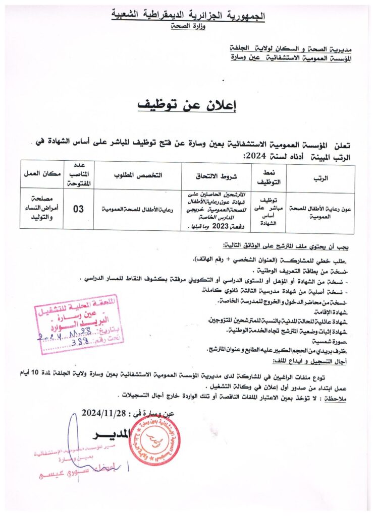 عون رعاية الأطفال للصحة العمومية | 03 | توظيف مباشر على أساس الشهادة | المترشحون الحاصلون على شهادة عون رعاية الأطفال للصحة العمومية من المدارس الخاصة دفعة 2023 وما قبلها. | مصلحة أمراض النساء والتوليد بعين وسارة |