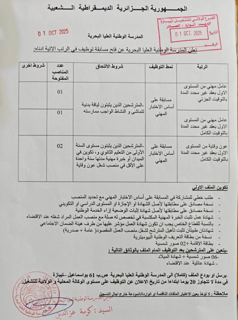 تعلن المدرسة الوطنية العليا البحرية عن فتح مسابقة توظيف على أساس الاختبار المهني للالتحاق بالرتب المبينة في الجدول أدناه:
