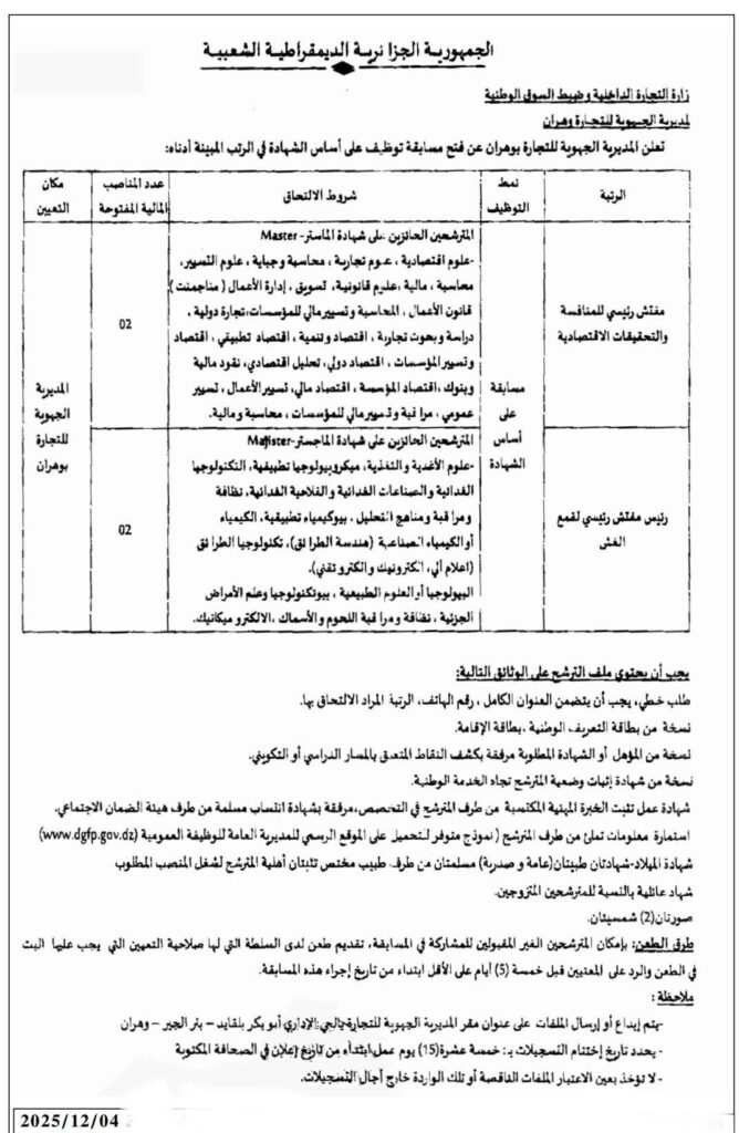 تعلن المديرية الجهوية للتجارة بوهران عن فتح مسابقة للتوظيف على أساس الشهادة في الرتب المبينة أدناه: