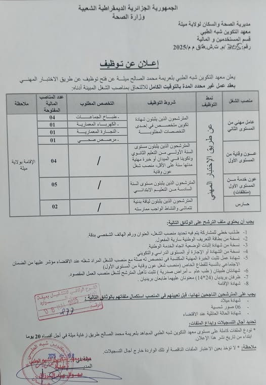 يعلن معهد التكوين شبه الطبي بـ ولاية ميلة عن فتح مسابقة توظيف عن طريق الاختبار المهني، بعقد عمل غير محدد المدة وبنظام الدوام الكامل، للالتحاق بالمناصب التالية:
