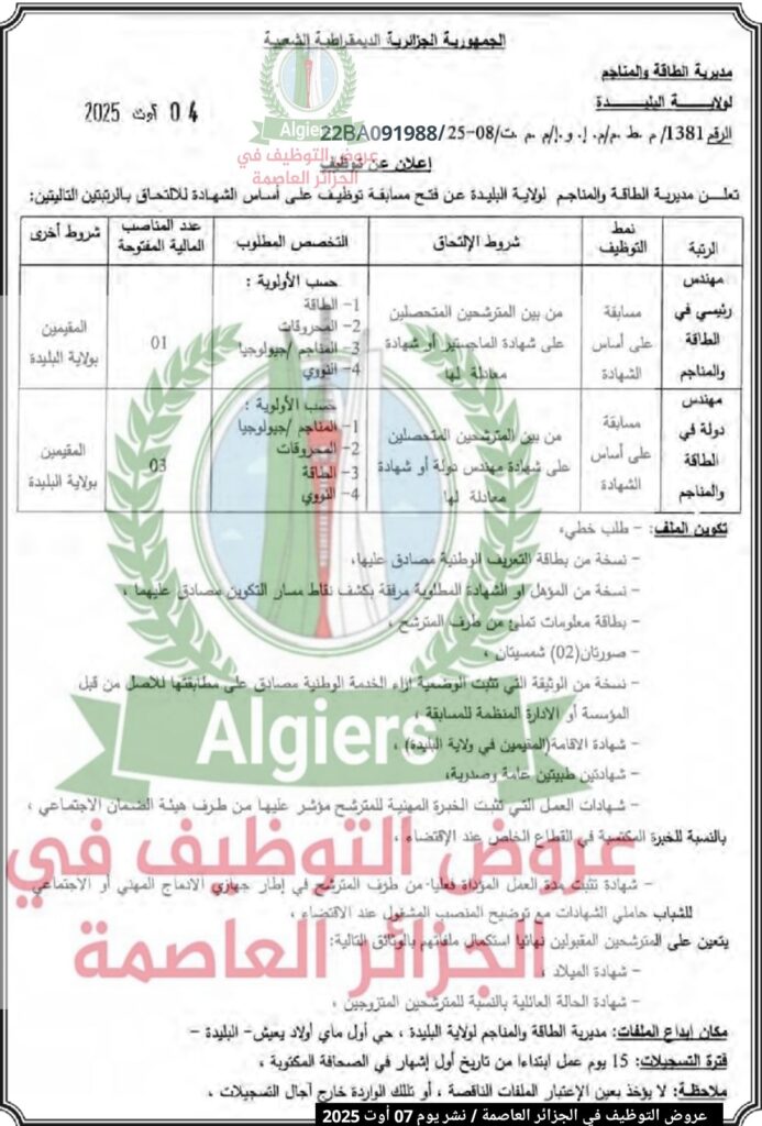 فتح مسابقة توظيف بمديرية الطاقة والمناجم لولاية البليدة