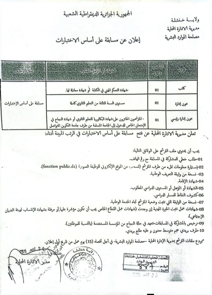 تعلن مديرية الإدارة المحلية لولاية خنشلة عن فتح مسابقة توظيف على أساس الاختبارات للالتحاق بالرتب المبينة أدناه: