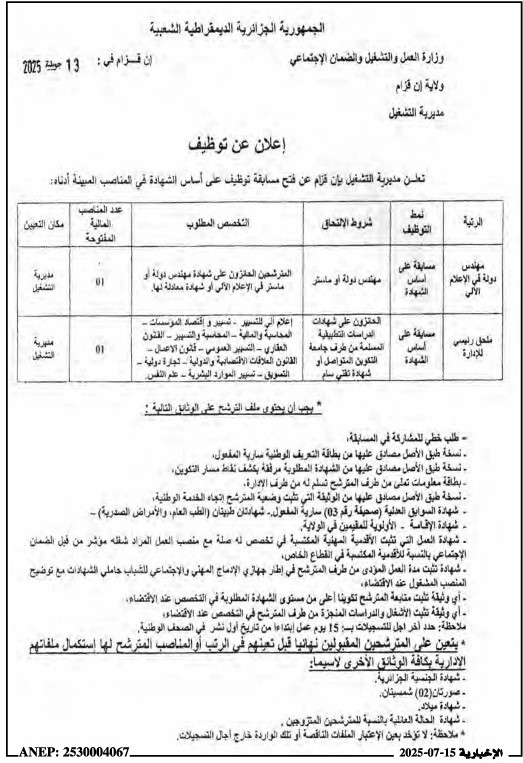 تعلن مديرية التشغيل بإن ڨزام عن فتح مسابقة توظيف على أساس الشهادة للالتحاق بالمناصب المبينة أدناه: