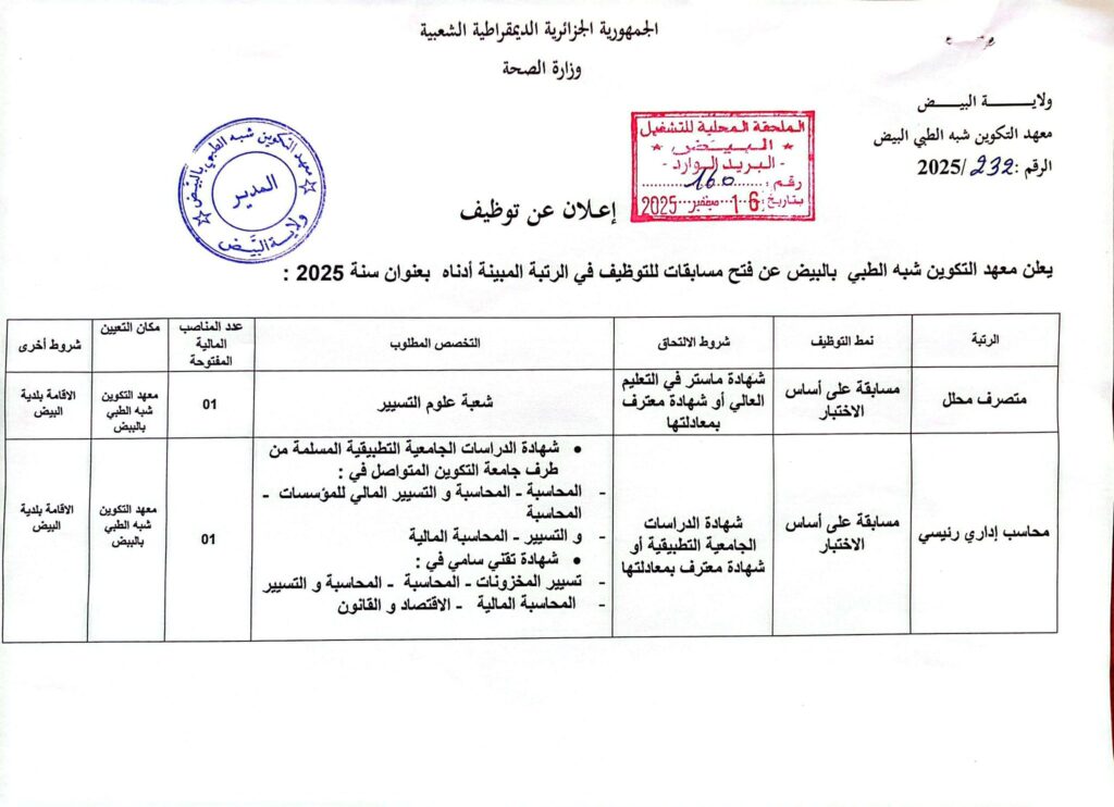 متصرف محلل | مسابقة على أساس الاختبار | شهادة ماستر في التعليم العالي أو شهادة معترف بمعادلتها. التخصص المطلوب: شعبة علوم التسيير. | 01 | معهد التكوين شبه الطبي بالبيض | الإقامة ببلدية البيض |