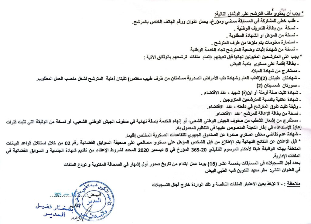 يعلن معهد التكوين شبه الطبي بالبيض عن فتح مسابقات للتوظيف بعنوان سنة 2025 في الرتب التالية:
