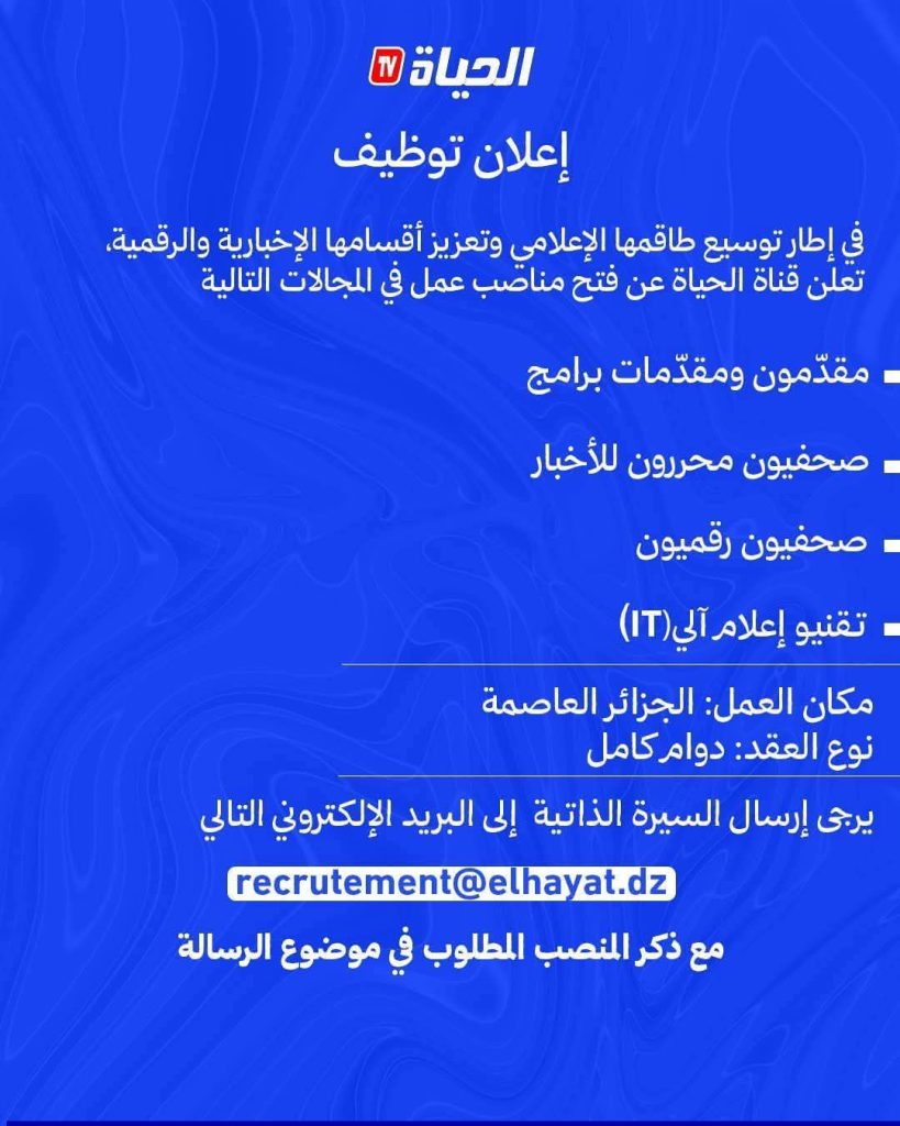 في إطار توسيع طاقمها الإعلامي وتعزيز أقسامها الإخبارية والرقمية، تعلن قناة الحياة عن فتح مناصب عمل في المجالات التالية: