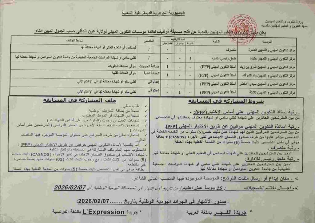 يعلن معهد التكوين والتعليم المهنيين بالمدية عن فتح مسابقة توظيف لفائدة مؤسسات التكوين المهني لولاية عين الدفلى حسب الجدول المبين أدناه: